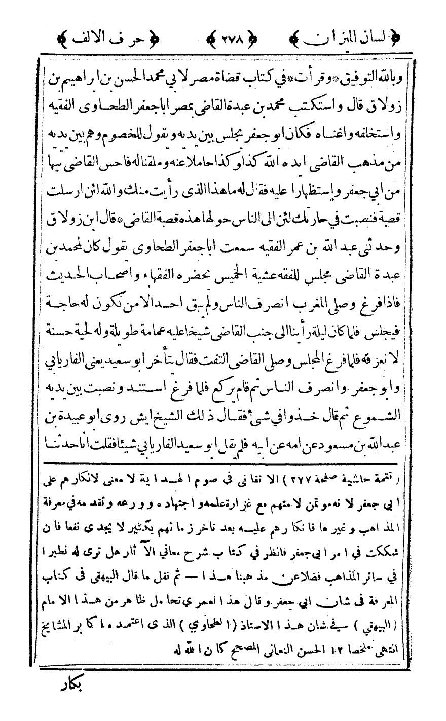 1 كيف يقبل هذا القول بغير دليل من البيهقي مع شهادة الائمة المتقدمين بجلالة قدره مثل الحافظ ابن عبد البر الأندلسي المالكي رحمه الله وهو أعلم من البيهقي بحال علماء ديار مغرب ومصر وأبي سعيد بن يونس المصري مؤرخ مصر ولا شك أنه أعلم من البيهقي بحال علماء مصر فإن صاحب البيت أدرى بما فيه وهما وهما اقرب زمانا بالطحاوي من البيهقي ولكن حمله على ذلك القول عصبية لمذهب الشافعي وتحامله على مذهب الحنفية كما يشهد له ماأودع كتابه السنن الكبرى وبسبب هذا التحامل أخطأ في مواضع كثيرة في تجريح الرجال وتوثيقهم وتصحيح الروايات المؤيدة لمذهبه وتضعيف الأحاديث الؤيدة للحنفية كما بينه صاحب الجوهر النقي أحسن بيان مع كونه حافظا مدعيا ان الحديث من صناعة ولكن التعصب والتحامل أذهله وصدق عليه من حفر بئرا لأخيه وقع فيه وإلى الله المشتكى وهو أعلم بالسرائر والضمائر وفي كشف الظنون في بيان معاني الآثار للطحاوي قال الاتقاني في صوم الهداية لامعنى لإنكارهم على أبي جعفر لأنه مؤتمن لا متهم مع غزارة علمه واجتهاده وورعه وتقدمه في معرفة المذاهب وغيرها فإنكارهم عليه بعد تأخر زمانهم بكثير لايجدي نفعا فإن شككت في أمر أبي جعفر فانظر في كتاب شرح معاني الآثار هل ترى له نظيرا في سائر المذاهب فضلا عن مذهبنا هذا – ثم نقل مقال البيهقي في كتاب المعرفة في شأن أبي جعفر وقال هذا لعمري تحامل ظاهر من هذا الإمام البيهقي في شأن هذا الأستاذ الطحاوي الذي اعتمده أكابر المشايخ انتهى ملخصا 12 الحسن النعماني المصحح كان الله له.