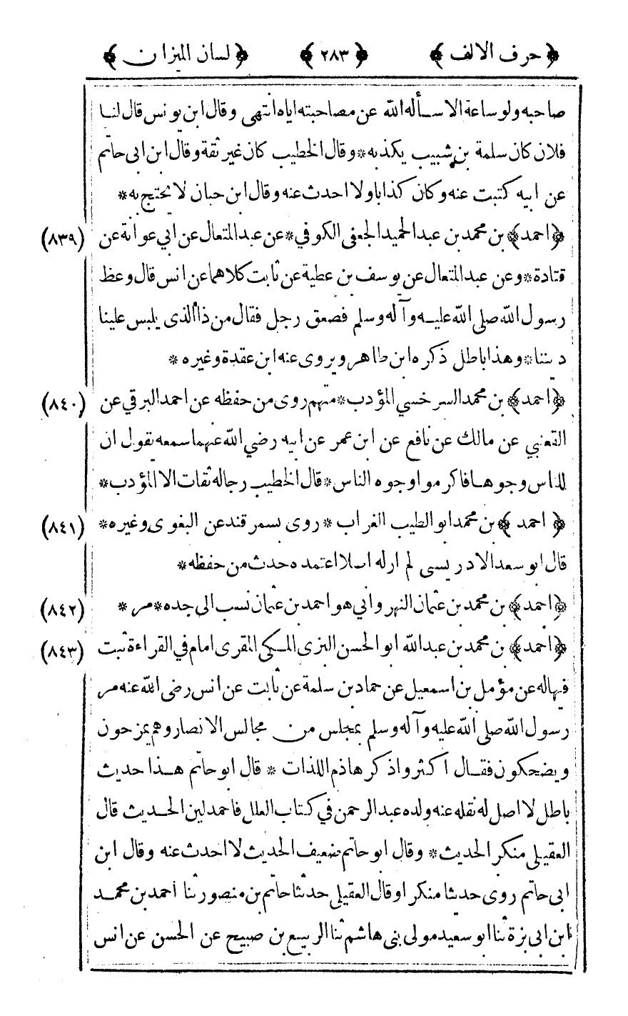 [840] "أحمد" بن محمد السرخسي المؤدب متهم روى من حفظه عن أحمد البرقي عن القعنبي عن مالك عن نافع عن ابن عمر عن أبيه رضى الله تعالى عنهما سمعه يقول أن للناس وجوها فأكرموا وجوه الناس قال الخطيب رجاله ثقات إلا المؤدب.
