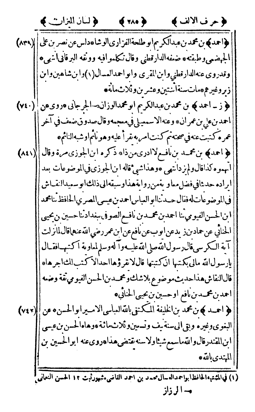 [840] "ز - أحمد" بن محمد بن عبد الكريم أبو محمد الوزان الجرجاني روى عن أحمد بن علي بن عمران وعنه الإسماعيلي في معجمه وقال صدوق ضعف في آخر عمره كتبت عنه في صحته ثم كنت أمر به يقرأ عليه وهو نائم أو شبه النائم.