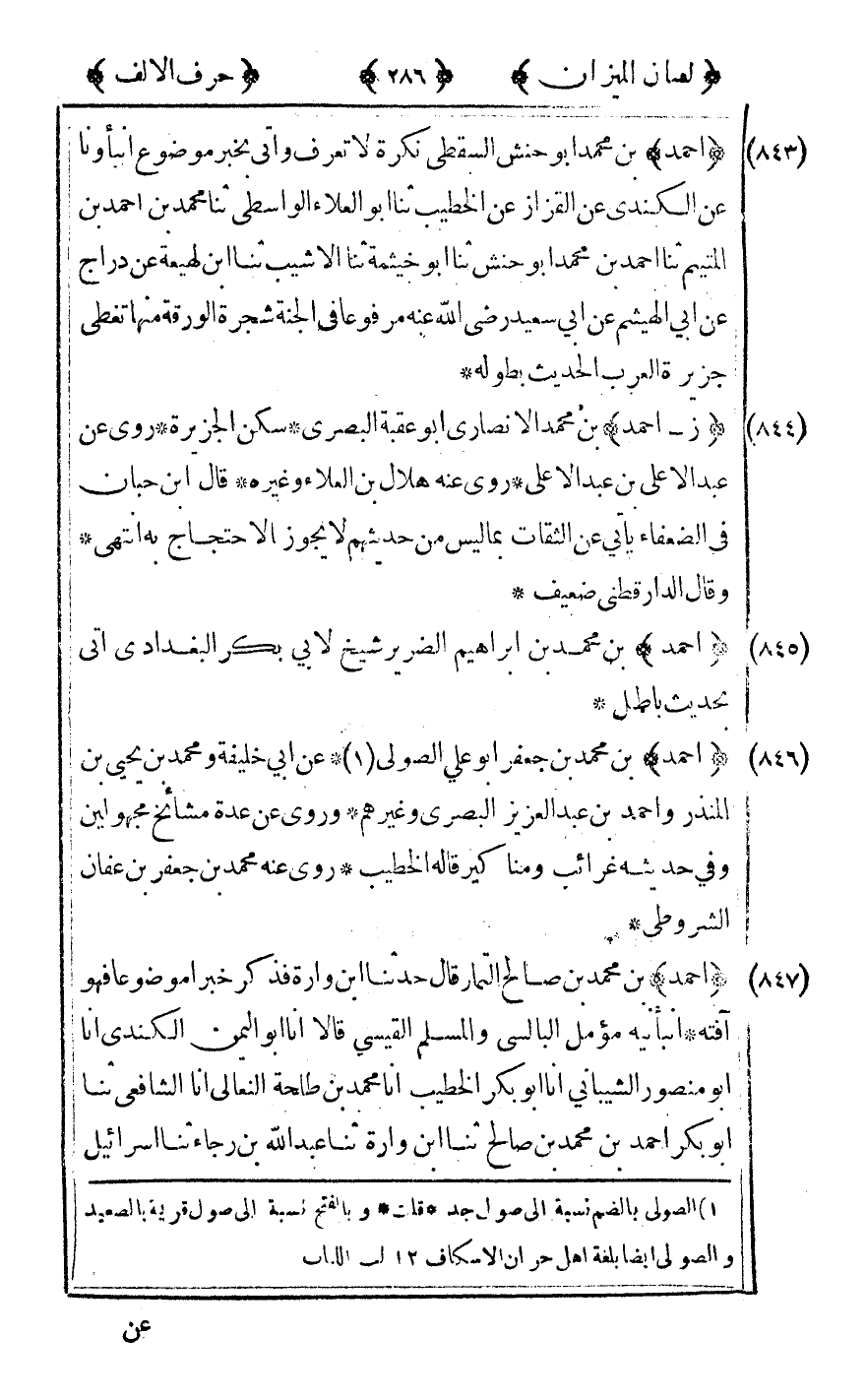 [843] "أحمد" بن محمد أبو حنش السقطي نكرة لا تعرف وأتى بخبر موضوع أنبأونا عن الكندي عن القزاز عن الخطيب ثنا أبو العلاء الواسطي ثنا محمد بن أحمد بن المتيم ثنا أحمد بن محمد أبو حنش ثنا أبو خيثمة ثنا الأشيب ثنا بن لهيعة عن دراج عن أبي الهيثم عن أبي سعيد رضى الله تعالى عنه مرفوعا في الجنة شجرة الورقة منها تغطي جزيرة العرب الحديث بطوله.