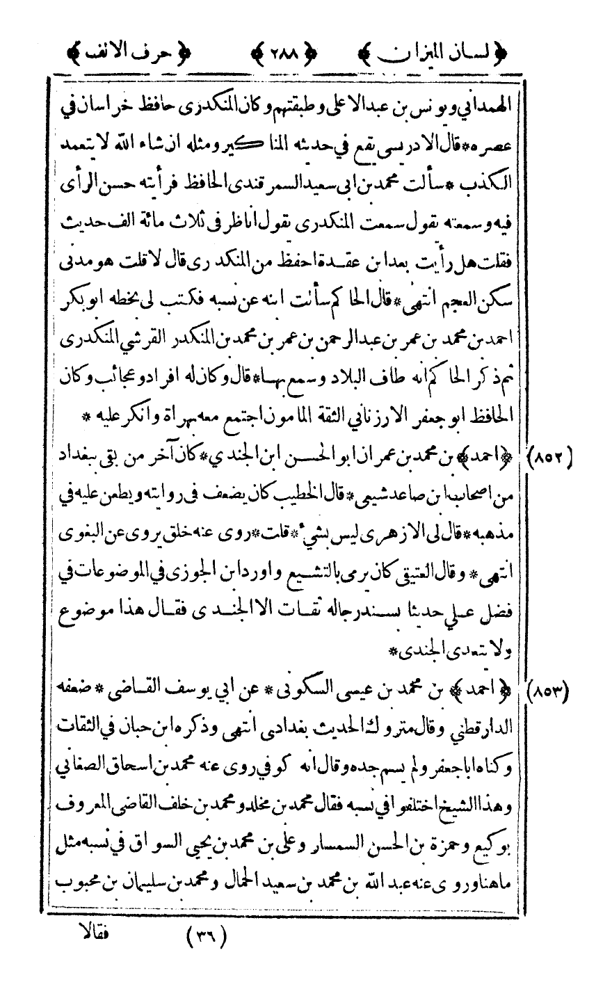 [852] "أحمد" بن محمد بن عمران أبو الحسن بن الجندي كان آخر من بقي ببغداد من أصحاب بن صاعد شيعي قال الخطيب كان يضعف في روايته ويطعن عليه في مذهبه قال لي الأزهري ليس بشيء قلت روى عنه خلق يروى عن البغوي انتهى وقال العتيقي كان يرمي بالتشيع وأورد بن الجوزي في الموضوعات في فضل علي حديثا بسند رجاله ثقات إلا الجندي فقال هذا موضوع ولا يتعدي الجندي.