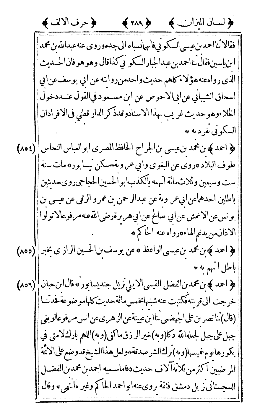 [854] "أحمد" بن محمد بن عيسى بن الجراح الحافظ المصري أبو العباس النحاس طوف البلاد روى عن البغوي وأبي عروبة سكن نيسابور مات سنة ست وسبعين وثلاث مائة اتهمه بالكذب أبو الحسين الحجاجي روى حديثين باطلين أحدهما عن أبي عروبة عن عبد الرحمن بن عمرو الرقي عن عيسى بن يونس عن الأعمش عن أبي صالح عن أبي هريرة رضى الله تعالى عنه مرفوعا: "لا تولوا الأذان من يدغم الهاء" رواه عنه الحاكم.