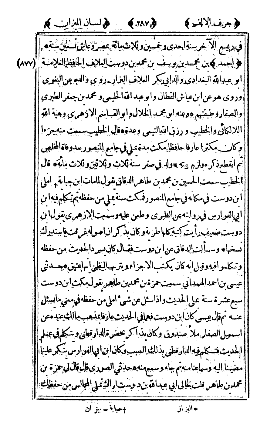 [877] "أحمد" بن محمد بن يوسف بن محمد بن دوست العلاف الحافظ العلامة أبو عبد الله البغدادي والد أبي بكر العلاف البزار روى والده عن البغوي وروى هو عن ابن عياش القطان وأبو عبد الله الحليمي ومحمد بن جعفر الطبري والصفار وطبقتهم وعنه أبو محمد الخلال وأبو القاسم الأزهري وهبة الله اللالكائي والخطيب ورزق الله التيمي وعدة قال الخطيب سمعت منه جزءا وكان مكثرا عارفا حافظا مكث مدة يملي في جامع المنصور بعد وفاة المخلص ثم انقطع ذكره ولزم بيته ولد في صفر سنة ثلاث وثلاثين وثلاث مائة قال الخطيب سمعت الحسين بن محمد بن طاهر الدقاق يقول لما مات بن جباية أملى بن دوست في مكانه في جامع المنصور فمكث سنة يملي من حفظه ثم تكلم فيه بن أبي الفوارس في روايته عن الطبري وطعن عليه وسمعت الأزهري يقول بن دوست ضعيف رأيت كتبه كلها طرية وكان يذكر أن أصوله غرقت فاستدرك نسخها وسألت الدقاق عن ابن دوست فقال كان يسرد الحديث من حفظه وتكلموا فيه وقيل أنه كان يكتب الأجزاء ويتربها ليظن أنها عتيق حدثني عيسى بن أحمد الهمداني سمعت حمزة بن محمد بن طاهر يقول مكث بن دوست سبع عشرة سنة يملي الحديث وإذا سئل عن شيء أملى من حفظه في معني ما يسئل عنه ثم قال عيسى كان بن دوست فهما في الحديث عارفا بمذهب مالك عنده عن إسماعيل الصفار ملأ صندوق وكان يذاكر بحضرة الدارقطني ويتكلم في علم الحديث فتكلم فيه الدارقطني بذلك السبب وكان بن أبي الفوارس ينكر علينا مضينا إليه وسماعنا منه ثم جاء وسمع منه حدثني الصوري قال قال لي حمزة بن محمد بن طاهر قلت لخالي أبي عبد الله بن دوست أراك تملي المجالس من حفظك