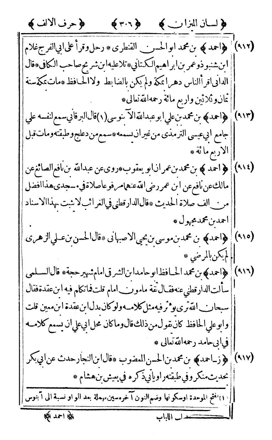 [914] "أحمد" بن محمد بن عمران أبو يعقوب روى عن عبد الله بن نافع الصائغ عن مالك عن نافع عن ابن عمر رضى الله تعالى عنهما مرفوعا صلاة في مسجدي هذا أفضل من ألف صلاة الحديث قال الدارقطني في الغرائب لا يثبت بهذا الإسناد أحمد بن محمد مجهول.