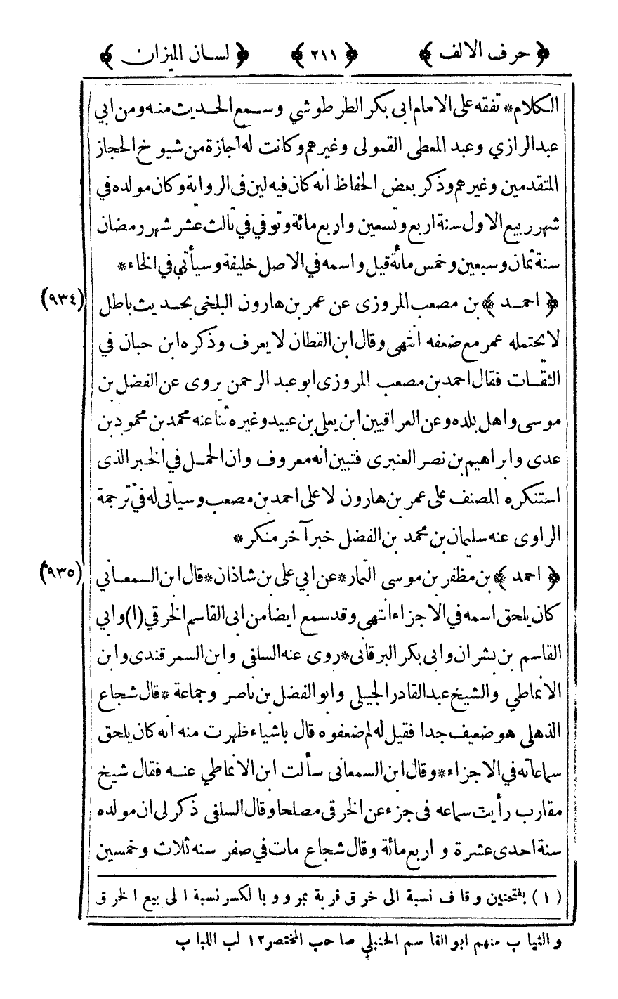 [934] "أحمد" بن مصعب المروزي عن عمر بن هارون البلخي بحديث باطل لا يحتمله عمر مع ضعفه انتهى وقال ابن القطان لا يعرف وذكره ابن حبان في الثقات فقال أحمد بن مصعب المروزي أبو عبد الرحمن يروي عن الفضل بن موسى وأهل بلده وعن العراقيين بن يعلى بن عبيد وغيره ثنا عنه محمد بن محمود بن عدي وإبراهيم بن نصر العنبري فتبين أنه معروف وأن الحمل في الخبر الذي استنكره المصنف على عمر بن هارون لا على أحمد بن مصعب وسيأتي له في ترجمة الراوي عنه سليمان بن محمد بن الفضل خبر آخر منكر.
