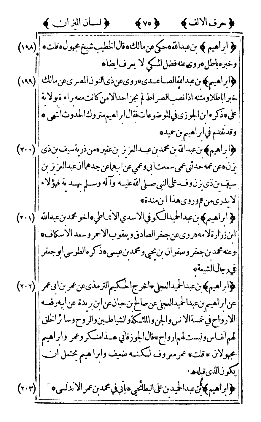 [199] "إبراهيم" بن عبد الله الصاعدي روى عن ذي النون المصري عن مالك خبرا باطلا ومتنه إذا نصب الصراط لم يجز أحد الا من كانت معه براءة بولاية علي ذكره ابن الجوزي في الموضوعات فقال إبراهيم متروك الحدوث انتهى.