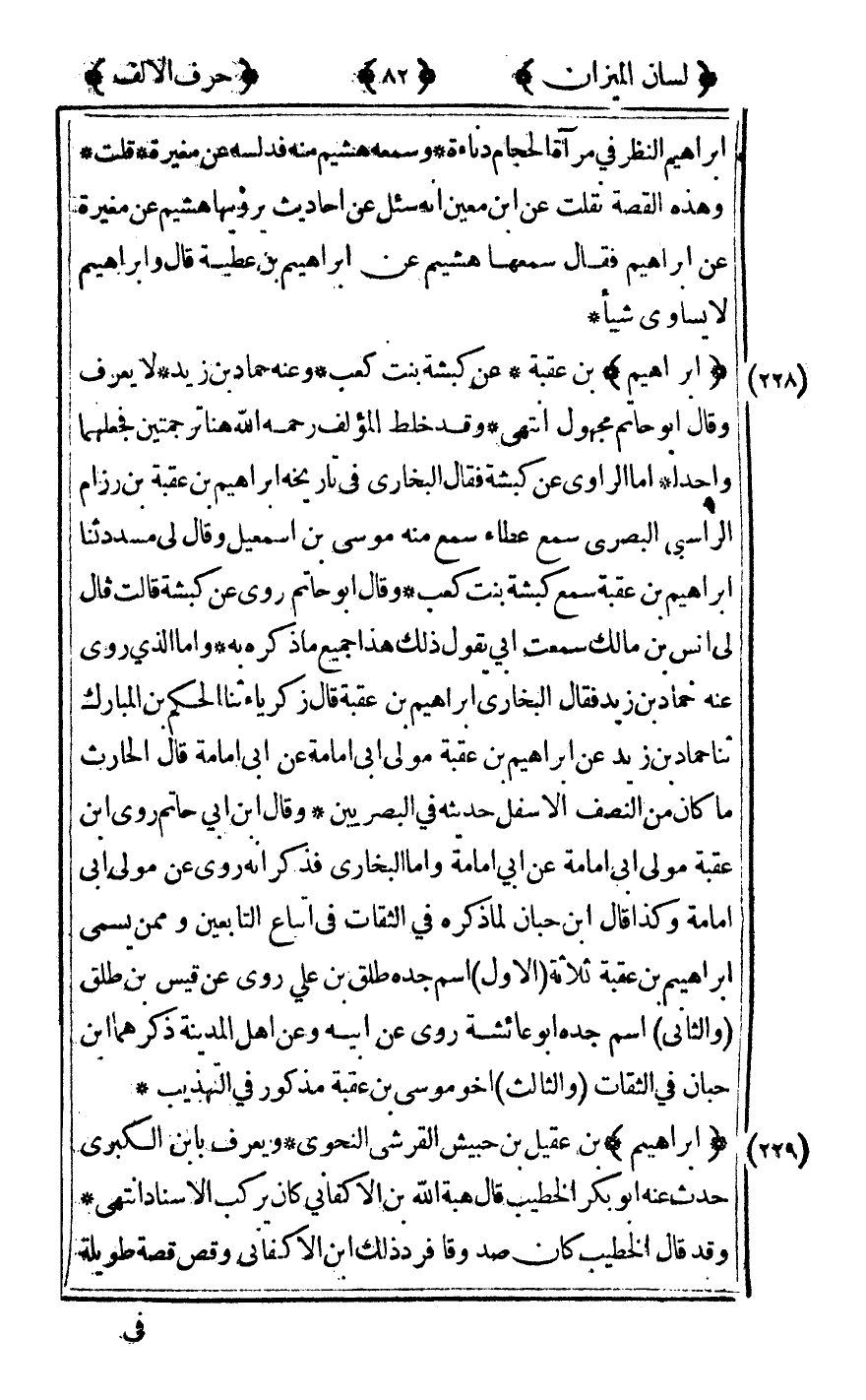 [229] "إبراهيم" بن عقيل بن حبيش القرشي النحوي ويعرف بابن الكبرى حدث عنه أبو بكر الخطيب قال هبة الله بن الأكفاني كان يركب الإسناد انتهى وقد قال الخطيب كان صدوقا فرد ذلك بن الكفاني وقص قصة طويلة