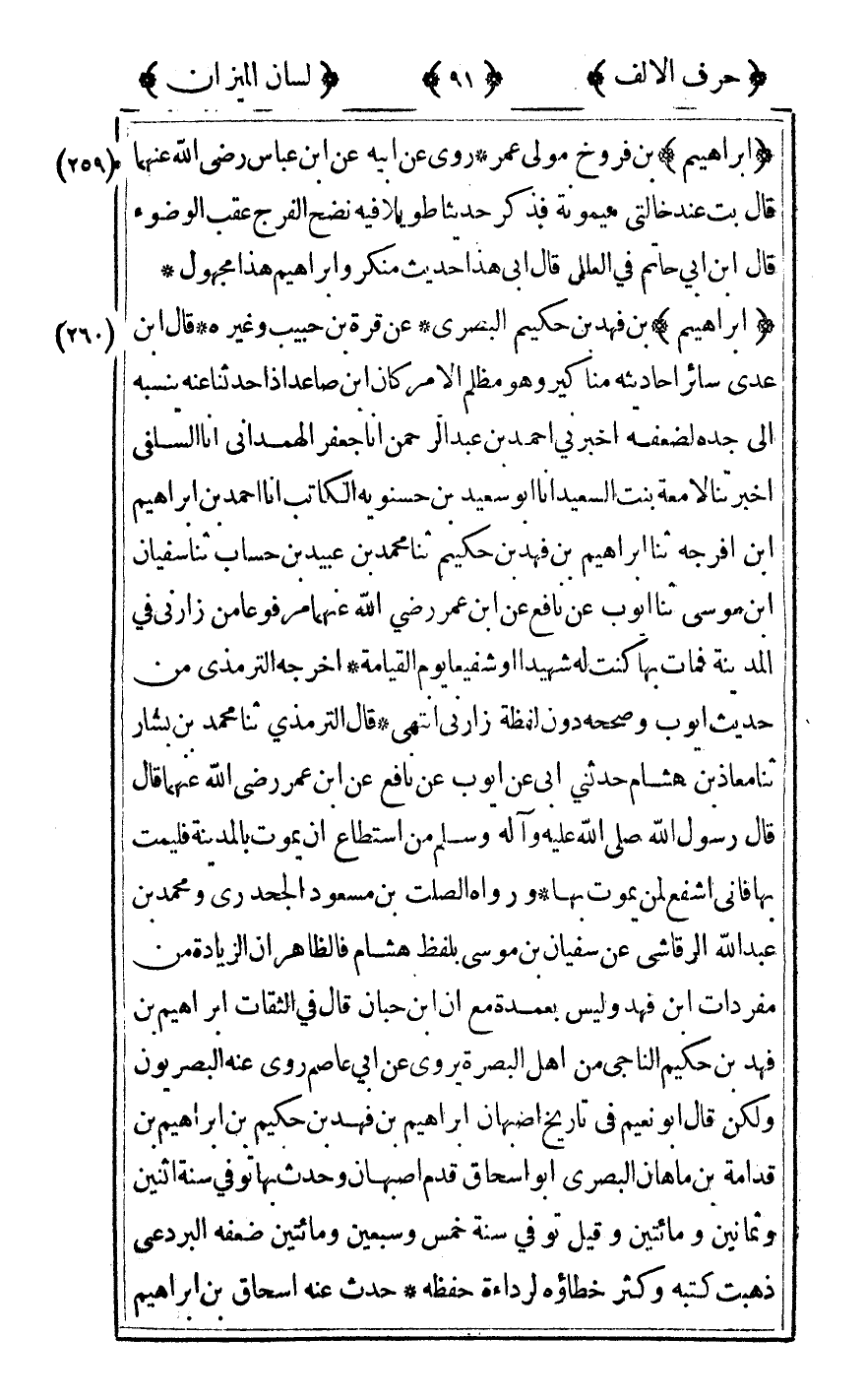 [260] "إبراهيم" بن فهد بن حكيم البصري عن قرة بن حبيب وغيره قال ابن عدي سائر أحاديثه مناكير وهو مظلم الأمر كان بن صاعد إذا حدثنا عنه ينسبه الى جده لضعفه أخبرني أحمد بن عبد الرحمن انا جعفر الهمداني انا السلفي أخبرتنا لامعة بنت السعيد انا أبو سعيد بن حسنويه الكاتب انا أحمد بن إبراهيم بن افرجه ثنا إبراهيم بن فهد بن حكيم ثنا محمد بن عبيد بن حساب ثنا سفيان بن موسى ثنا أيوب عن نافع عن ابن عمر رضى الله تعالى عنهما مرفوعا من زارني في المدينة فمات بها كنت له شهيدا أو شفيعا يوم القيامة أخرجه الترمذي من حديث أيوب وصححه دون لفظة زارني انتهى قال الترمذي ثنا محمد بن بشار ثنا معاذ بن هشام حدثني أبي عن أيوب عن نافع عن ابن عمر رضى الله تعالى عنهما قال قال رسول الله صلى الله عليه وسلم: "من استطاع أن يموت بالمدينة فليمت بها فاني أشفع لمن يموت بها" ورواه الصلت بن مسعود الجحدري ومحمد بن عبد الله الرقاشي عن سفيان بن موسى بلفظ هشام فالظاهر ان الزيادة من مفردات بن فهد وليس بعمدة مع ان بن حبان قال في الثقات إبراهيم بن فهد بن حكيم الناجي من أهل البصرة يروي عن أبي عاصم روى عنه البصريون ولكن قال أبو نعيم في تاريخ أصبهان إبراهيم بن فهد بن حكيم بن إبراهيم بن قدامة بن ماهان البصري أبو إسحاق قدم أصبهان وحدث بها توفي سنة اثنين وثمانين ومائتين وقيل توفي سنة خمس وسبعين ومائتين ضعفه البردعي ذهبت كتبه وكثر خطاؤه لرداءة حفظه حدث عنه إسحاق بن إبراهيم