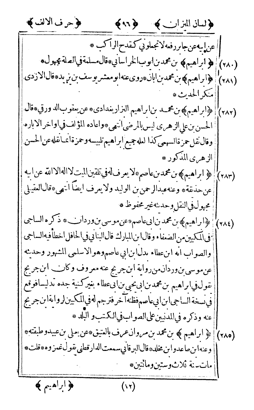 [282] "إبراهيم" بن محمد بن إبراهيم البزار بغدادي عن يعقوب الدورقي قال الحسن بن علي الزهري ليس بالمرضي انتهى واعاده المؤلف في أواخر الاباره وقال نقل حمزة السهمي كذا لعله جميع إبراهيم تلبيسه وحمزة إنما نقله عن الحسن الزهري المذكور.