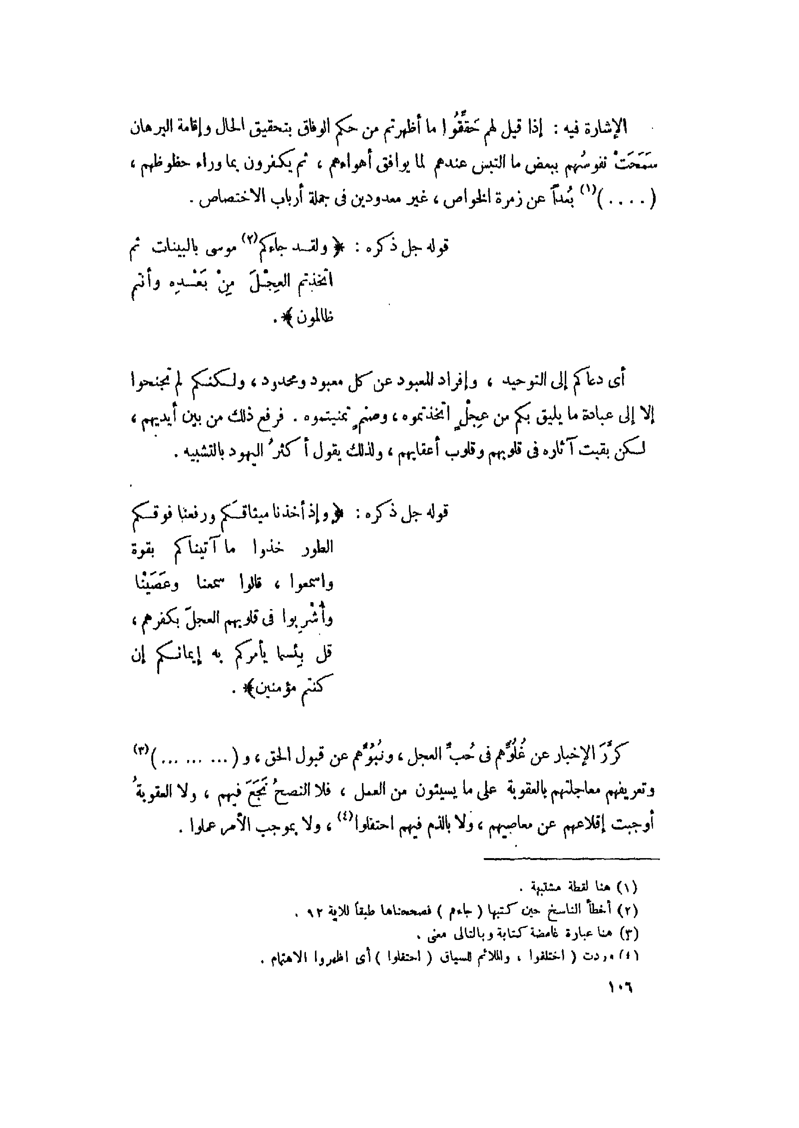 «2» أي دعاكم إلى التوحيد، وإفراد المعبود عن كل معبود ومحدود، ولكنكم لم تجنحوا إلا إلى عبادة ما يليق بكم من عجل اتخذتموه، وصنم تمنيتموه. فرفع ذلك من بين أيديهم، لكن بقيت آثاره فى قلوبهم وقلوب أعقابهم، ولذلك يقول أكثر اليهود بالتشبيه.