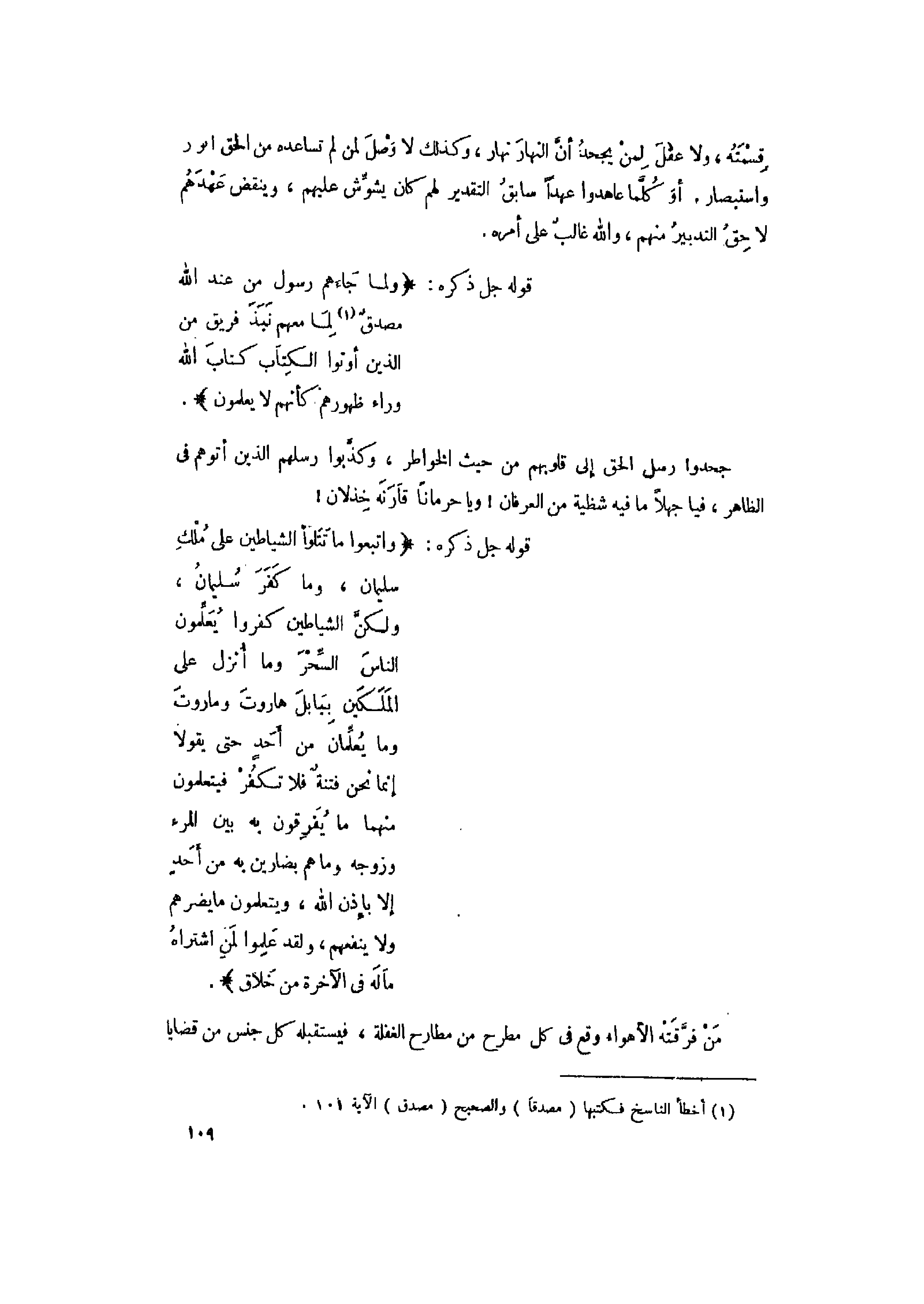 وَاتَّبَعُوا ما تَتْلُوا الشَّياطِينُ عَلى مُلْكِ سُلَيْمانَ وَما كَفَرَ سُلَيْمانُ وَلكِنَّ الشَّياطِينَ كَفَرُوا يُعَلِّمُونَ النَّاسَ السِّحْرَ وَما أُنْزِلَ عَلَى الْمَلَكَيْنِ بِبابِلَ هارُوتَ وَمارُوتَ وَما يُعَلِّمانِ مِنْ أَحَدٍ حَتَّى يَقُولا إِنَّما نَحْنُ فِتْنَةٌ فَلا تَكْفُرْ فَيَتَعَلَّمُونَ مِنْهُما ما يُفَرِّقُونَ بِهِ بَيْنَ الْمَرْءِ وَزَوْجِهِ وَما هُمْ بِضارِّينَ بِهِ مِنْ أَحَدٍ إِلاَّ بِإِذْنِ اللَّهِ وَيَتَعَلَّمُونَ ما يَضُرُّهُمْ وَلا يَنْفَعُهُمْ وَلَقَدْ عَلِمُوا لَمَنِ اشْتَراهُ ما لَهُ فِي الْآخِرَةِ مِنْ خَلاقٍ وَلَبِئْسَ ما شَرَوْا بِهِ أَنْفُسَهُمْ لَوْ كانُوا يَعْلَمُونَ (102)