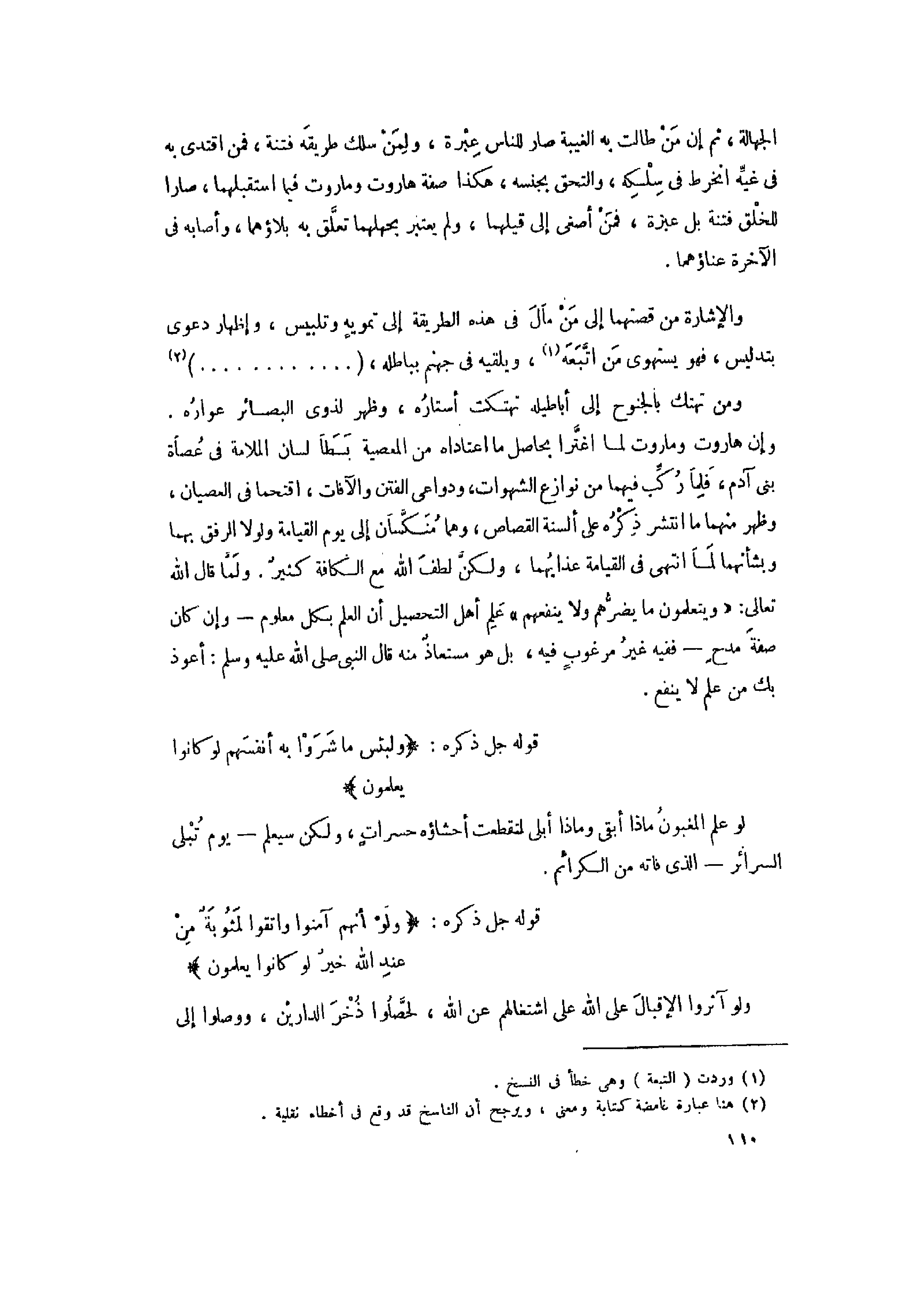 الجهالة، ثم إن من طالت به الغيبة صار للناس عبرة، ولمن سلك طريقه فتنة، فمن اقتدى به فى غيّه انخرط فى سلكه، والتحقق بجنسه، هكذا صفة هاروت وماروت فيما استقبلهما، صارا للخلق فتنة بل عبرة، فمن أصغى إلى قيلهما، ولم يعتبر بجهلهما تعلّق به بلاؤهما، وأصابه فى الآخرة عناؤهما.