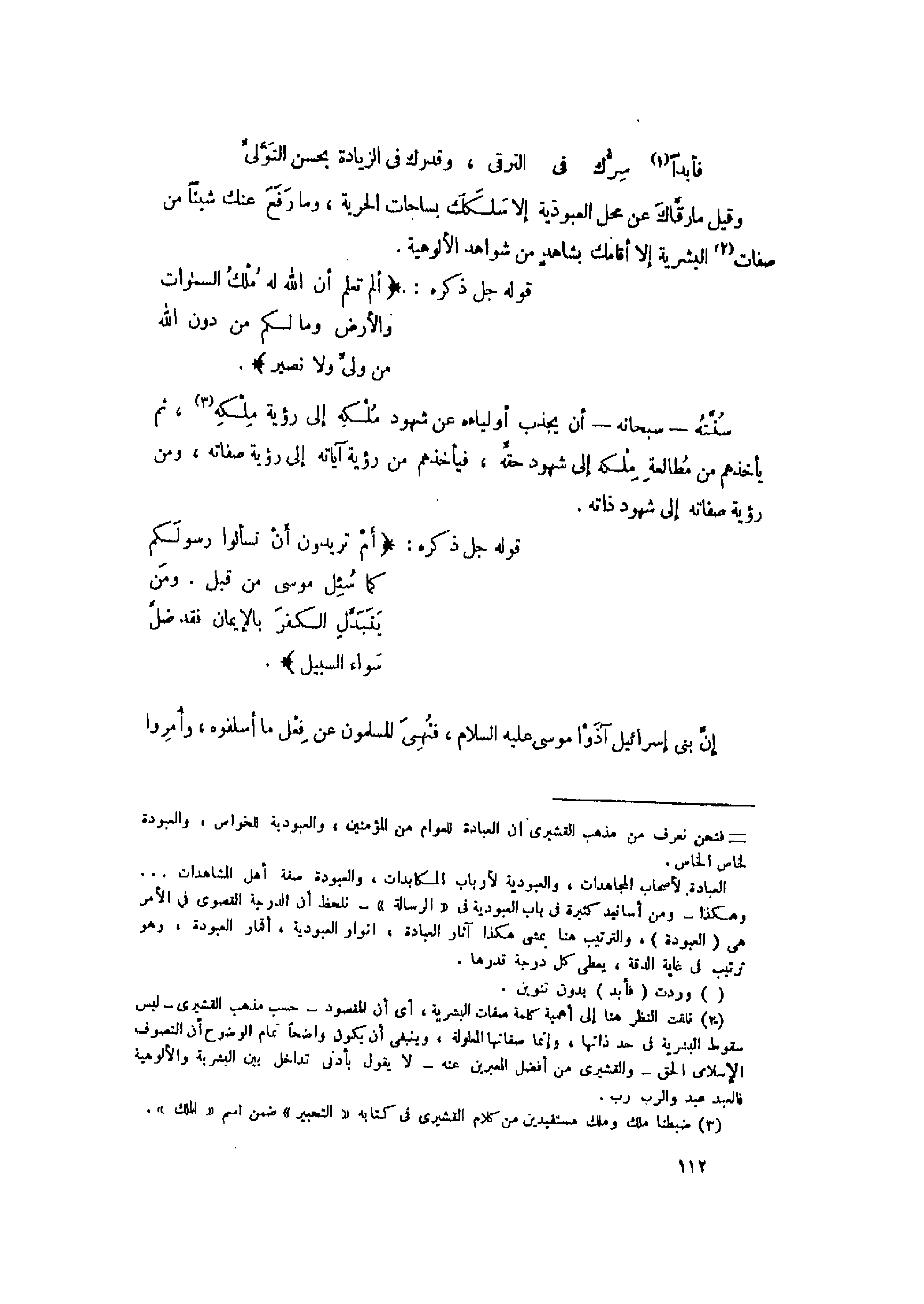 (2) تلقت النظر هنا إلى أهمية كلمة صفات البشرية، أي أن المقصود- حسب مذهب القشيري- ليس سقوط البشرية فى حد ذاتها، وإنما صفاتها المعلولة، وينبغى أن يكون واضحا تمام الوضوح أن التصوف الإسلامى الحق- والقشيري من أفضل المعبرين عنه- لا يقول بأدنى تداخل بين البشرية والألوهية فالعبد عبد والرب رب.