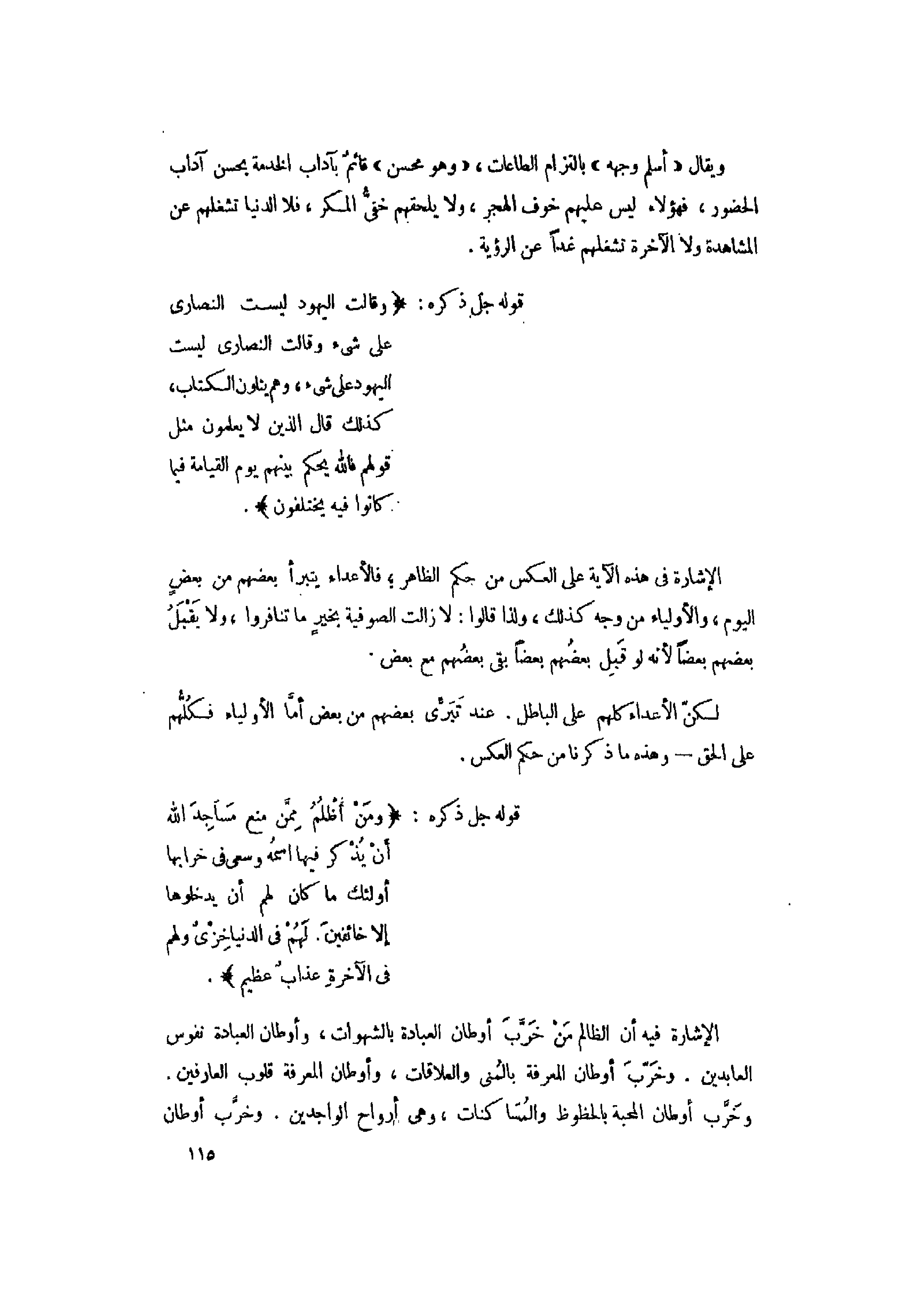 ويقال «أسلم وجهه» بالتزام الطاعات، «وهو محسن» قائم بآداب الخدمة بحسن آداب الحضور، فهؤلاء ليس عليهم خوف الهجر، ولا يلحقهم خفىّ المكر، فلا الدنيا تشغلهم عن المشاهدة ولا الآخرة تشغلهم غدا عن الرؤية.