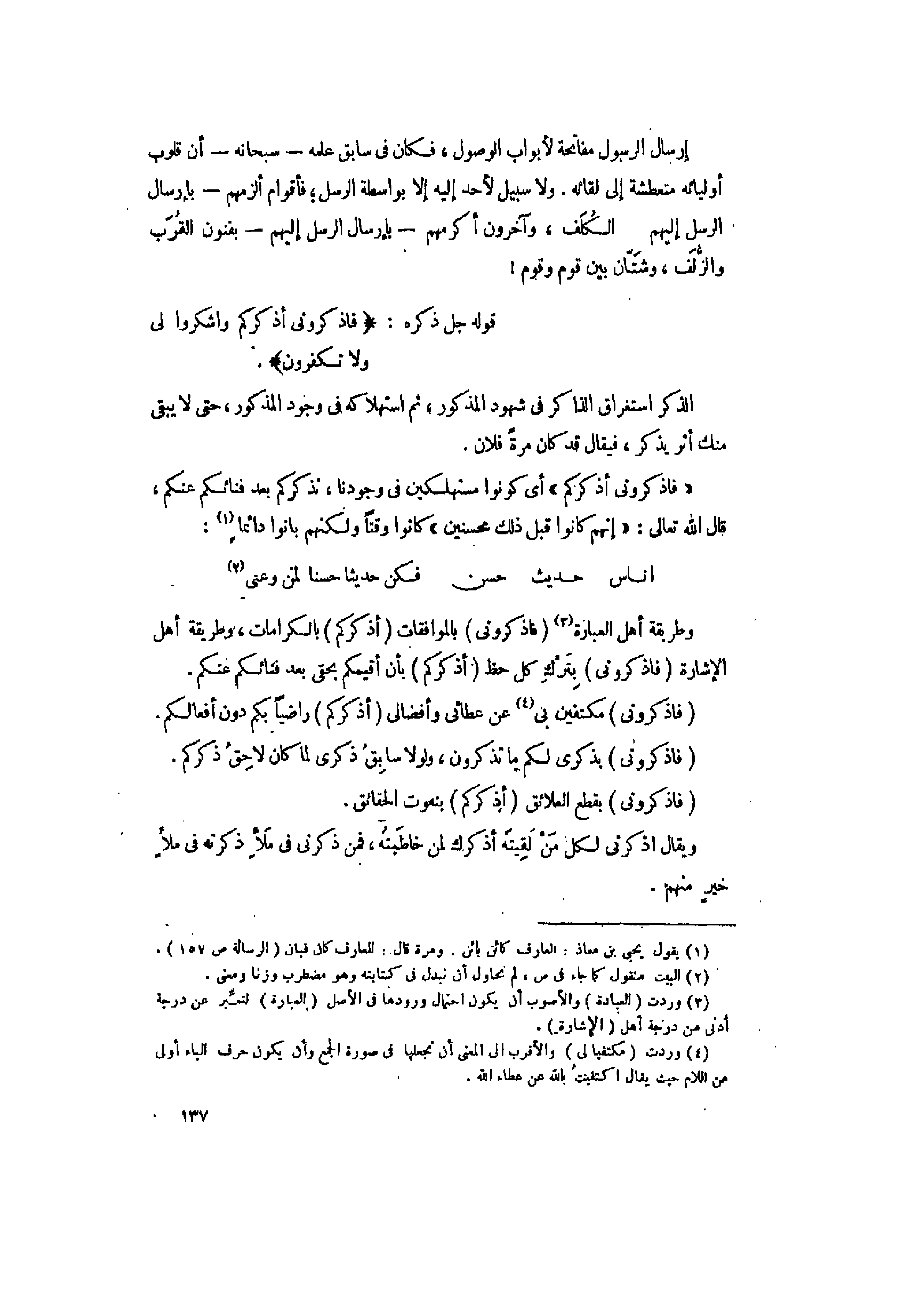 «فَاذْكُرُونِي أَذْكُرْكُمْ» أي كونوا مستهلكين فى وجودنا، نذكركم بعد فنائكم عنكم، قال الله تعالى: «إِنَّهُمْ كانُوا قَبْلَ ذلِكَ مُحْسِنِينَ» كانوا وقتا ولكنهم بانوا دائما «1» :