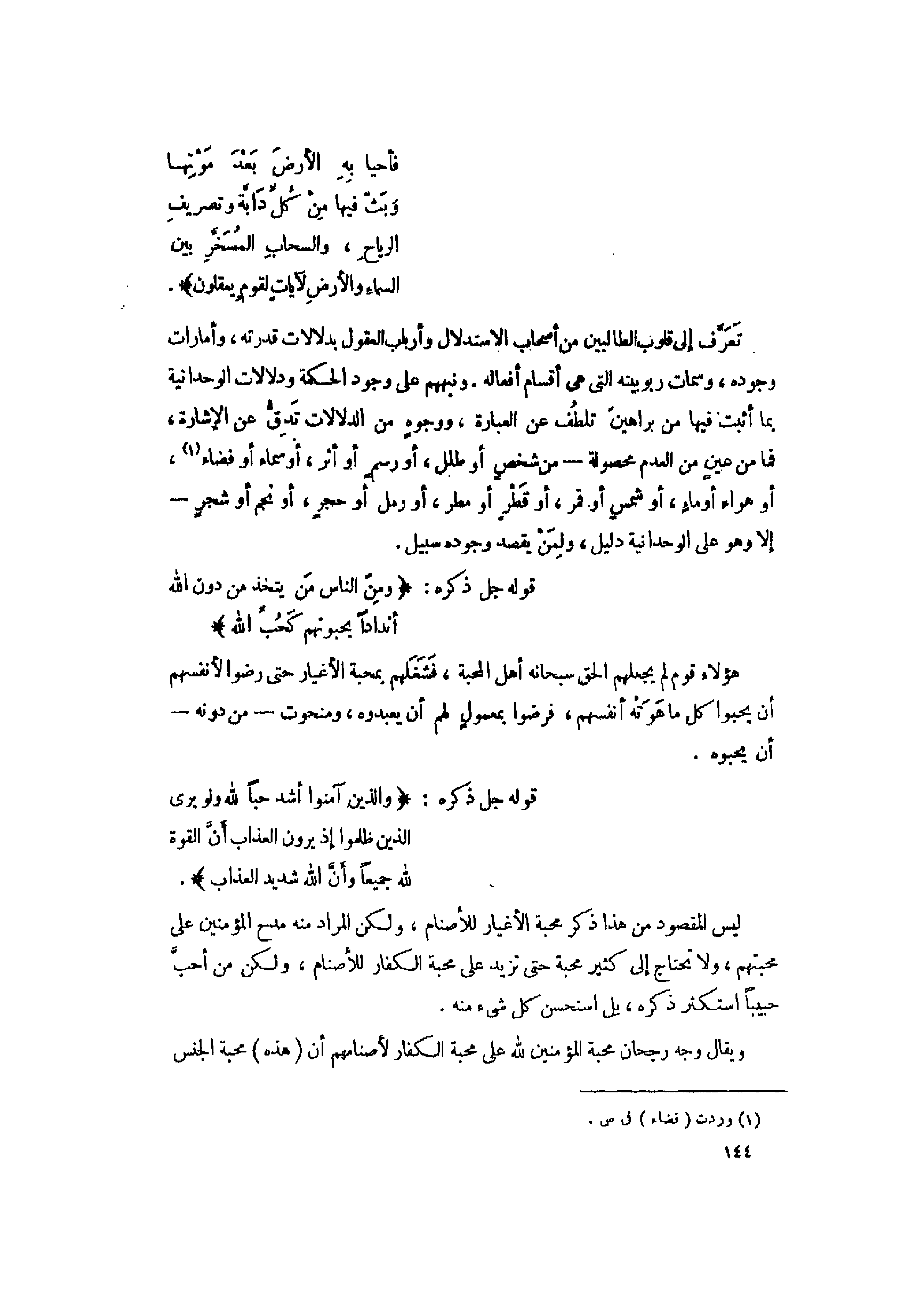 تعرّف إلى قلوب الطالبين من أصحاب الاستدلال وأرباب العقول بدلالات قدرته، وأمارات وجوده، وسمات ربوبيته التي هى أقسام أفعاله. ونبههم على وجود الحكمة ودلالات الوحدانية بما أثبت فيها من براهين تلطف عن العبارة، ووجوه من الدلالات تدقّ عن الإشارة، فما من عين من العدم محصولة- من شخص أو طلل، أو رسم أو أثر، أو سماء أو فضاء «1» ، أو هواء أو ماء، أو شمس أو قمر، أو قطر أو مطر، أو رمل أو حجر، أو نجم أو شجر- إلا وهو على الوحدانية دليل، ولمن يقصد وجوده سبيل.