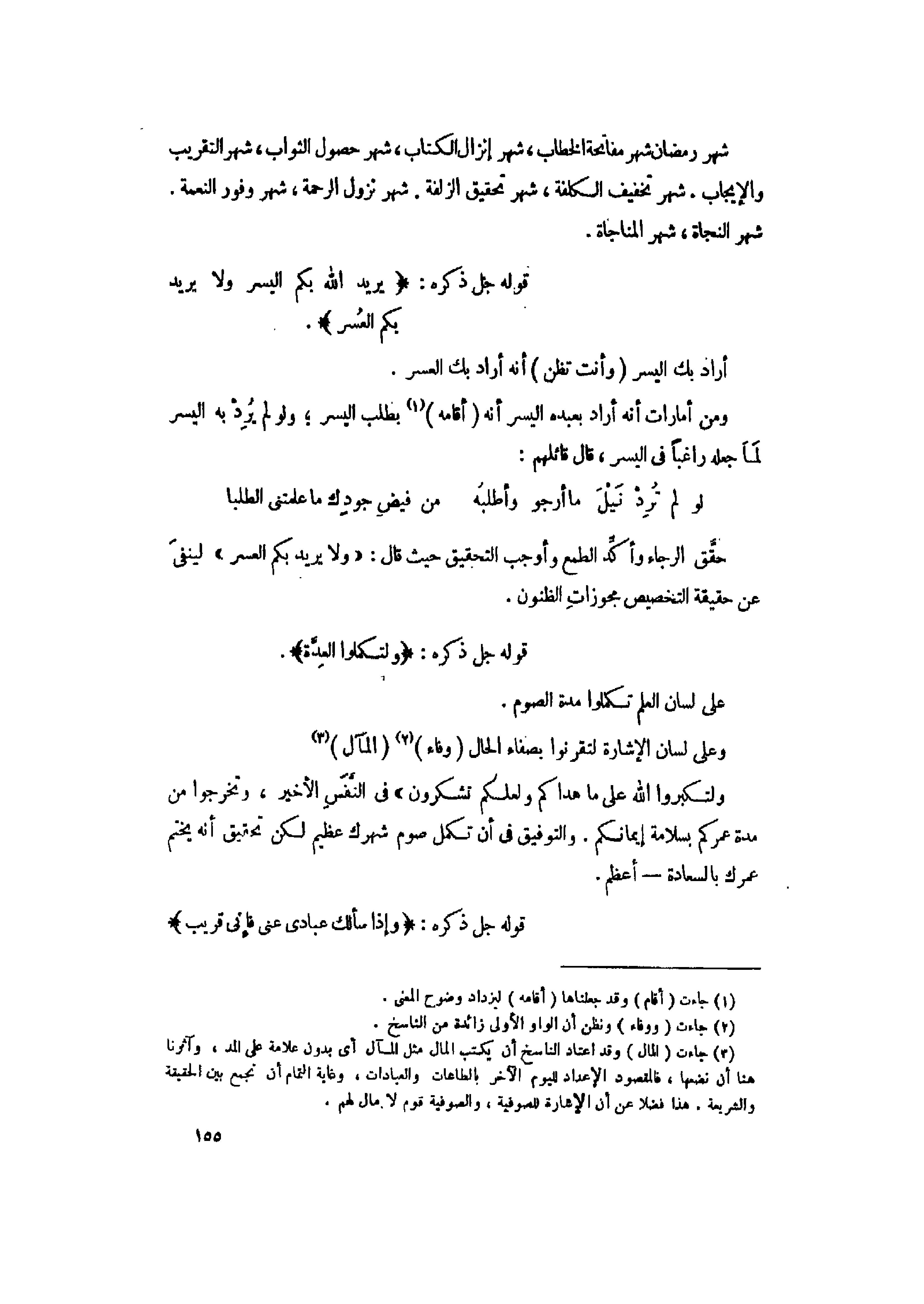 وعلى لسان الإشارة لتقرنوا بصفاء الحال (وفاء) «2» (المآل) «3» ولتكبروا الله على ما هداكم ولعلكم تشكرون» فى النّفس الأخير، وتخرجوا من مدة عمركم بسلامة إيمانكم. والتوفيق فى أن تكمل صوم شهرك عظيم لكن تحقيق أنه يختم عمرك بالسعادة- أعظم.