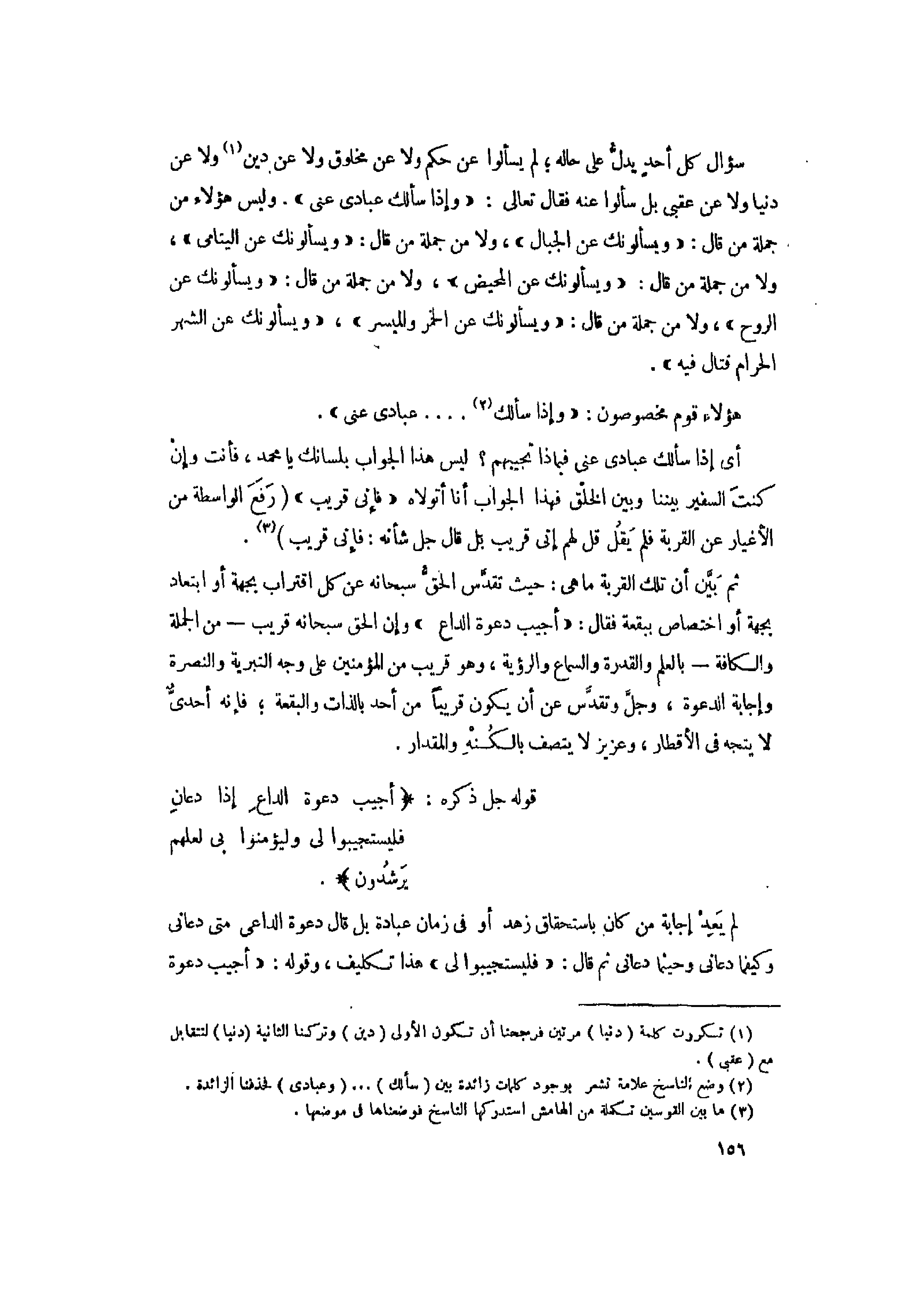 (2) وضع الناسخ علامة تشعر بوجود كلمات زائدة بين (سألك) ... (وعبادى) فحذفنا الزائدة.