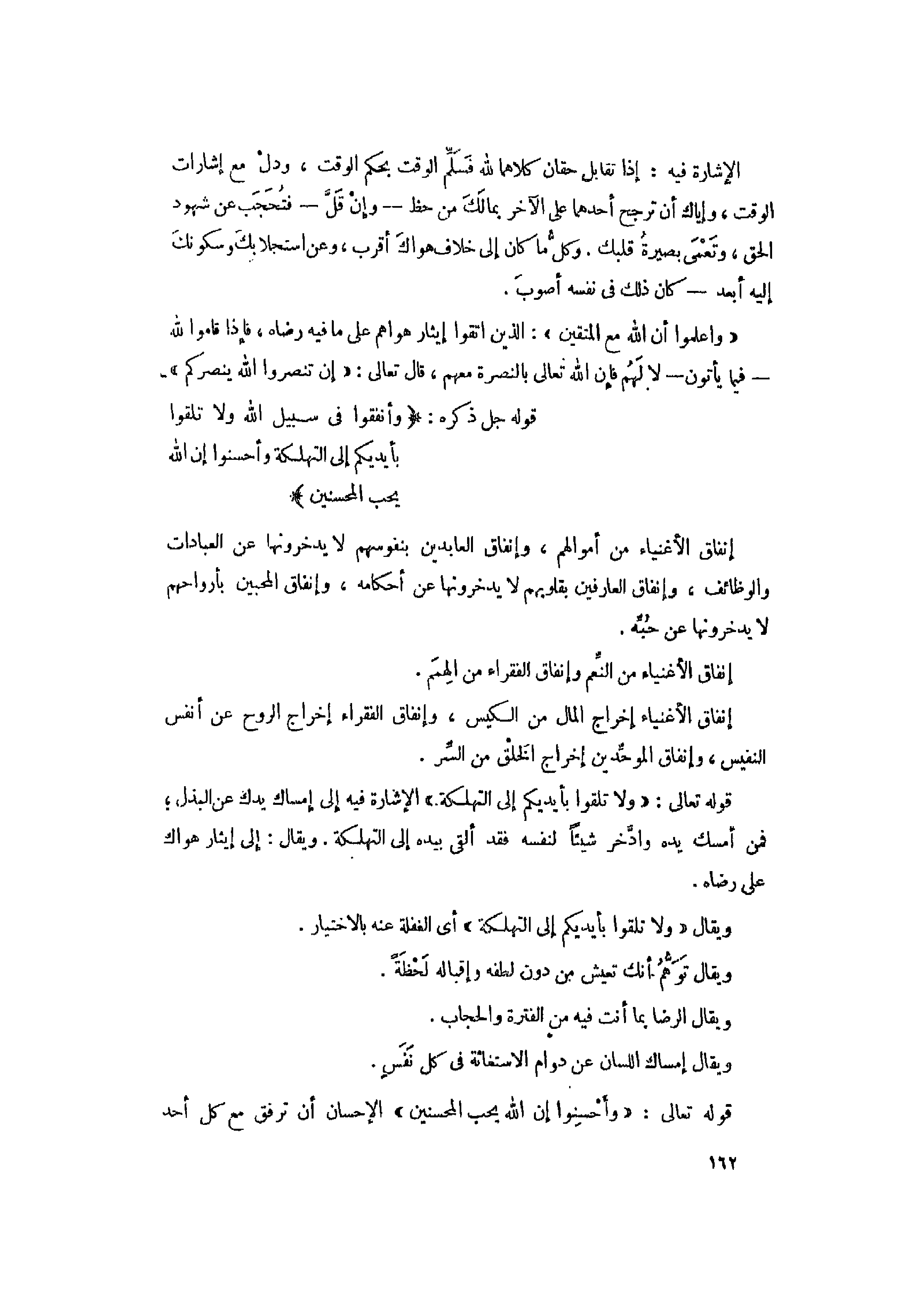 قوله تعالى: «وَلا تُلْقُوا بِأَيْدِيكُمْ إِلَى التَّهْلُكَةِ» الإشارة فيه إلى إمساك يدك عن البذل فمن أمسك يده وادّخر شيئا لنفسه فقد ألقى بيده إلى التهلكة. ويقال: إلى إيثار هواك على رضاه.