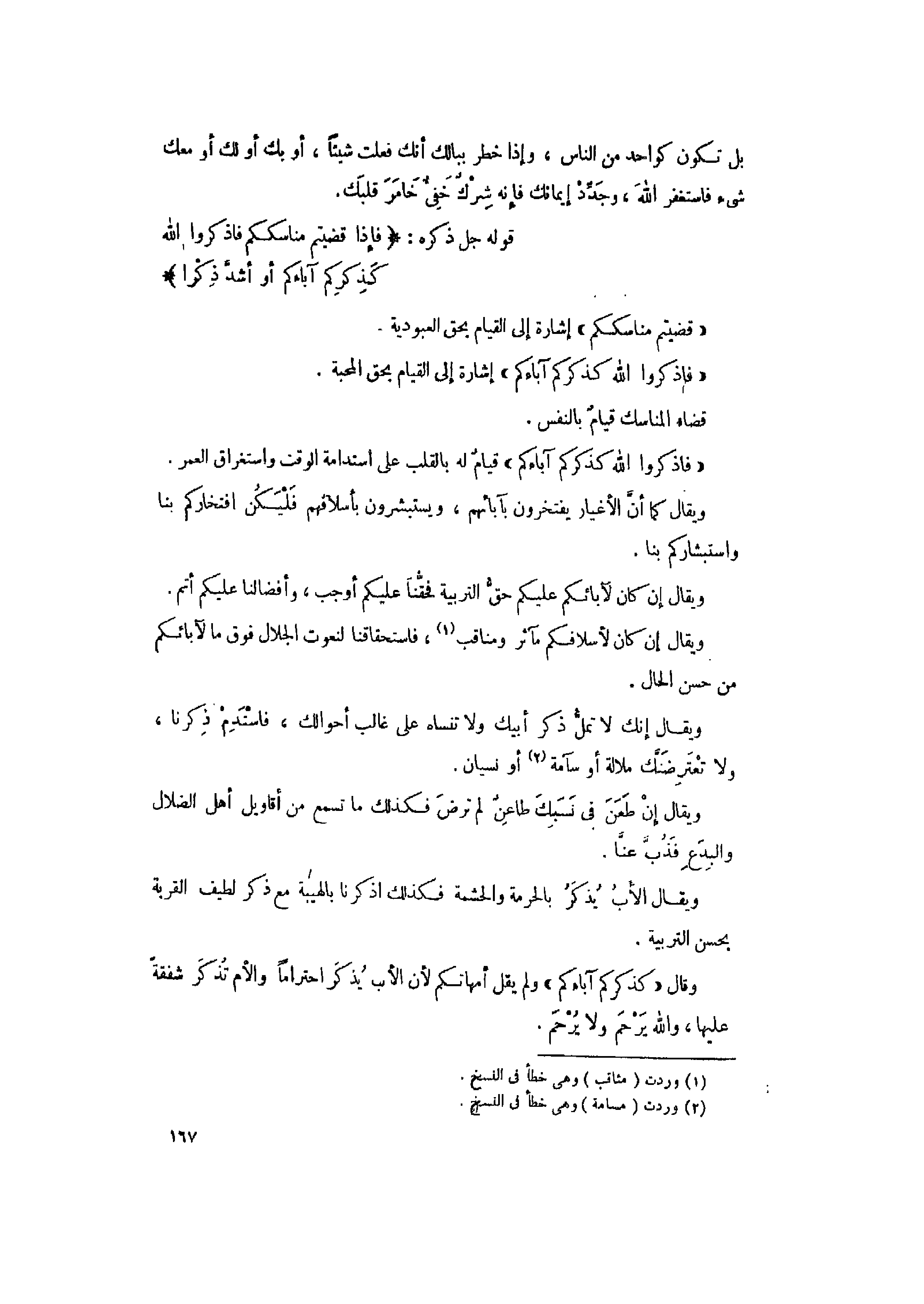 وقال «كَذِكْرِكُمْ آباءَكُمْ» ولم يقل أمهاتكم لأن الأب يذكر احتراما والأم تذكر شفقة عليها، والله يرحم ولا يرحم.