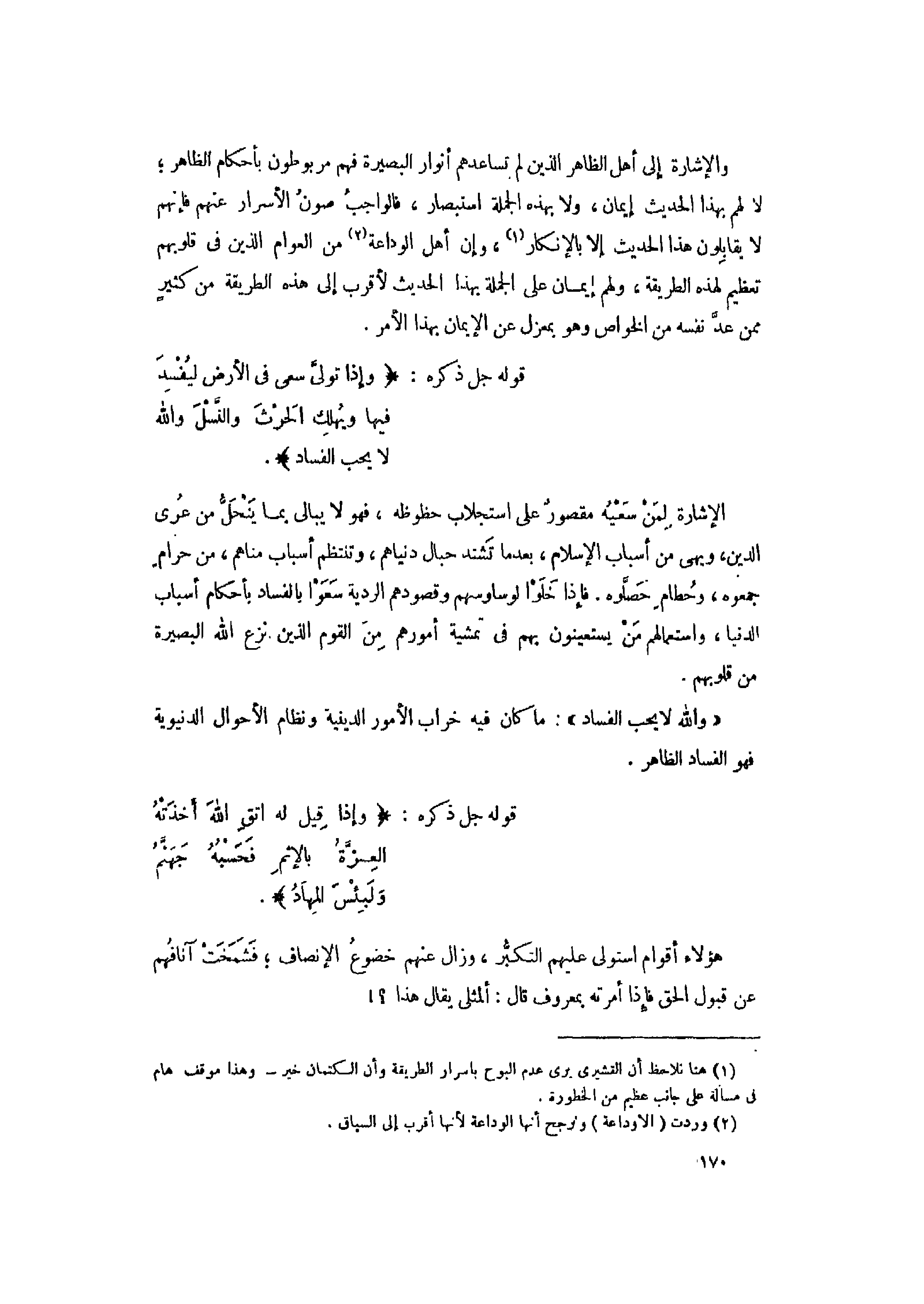 (1) هنا نلاحظ أن القشيري يرى عدم البوح باسرار الطريقة وأن الكتمان خير- وهذا موقف هام فى مسألة على جانب عظيم من الخطورة.