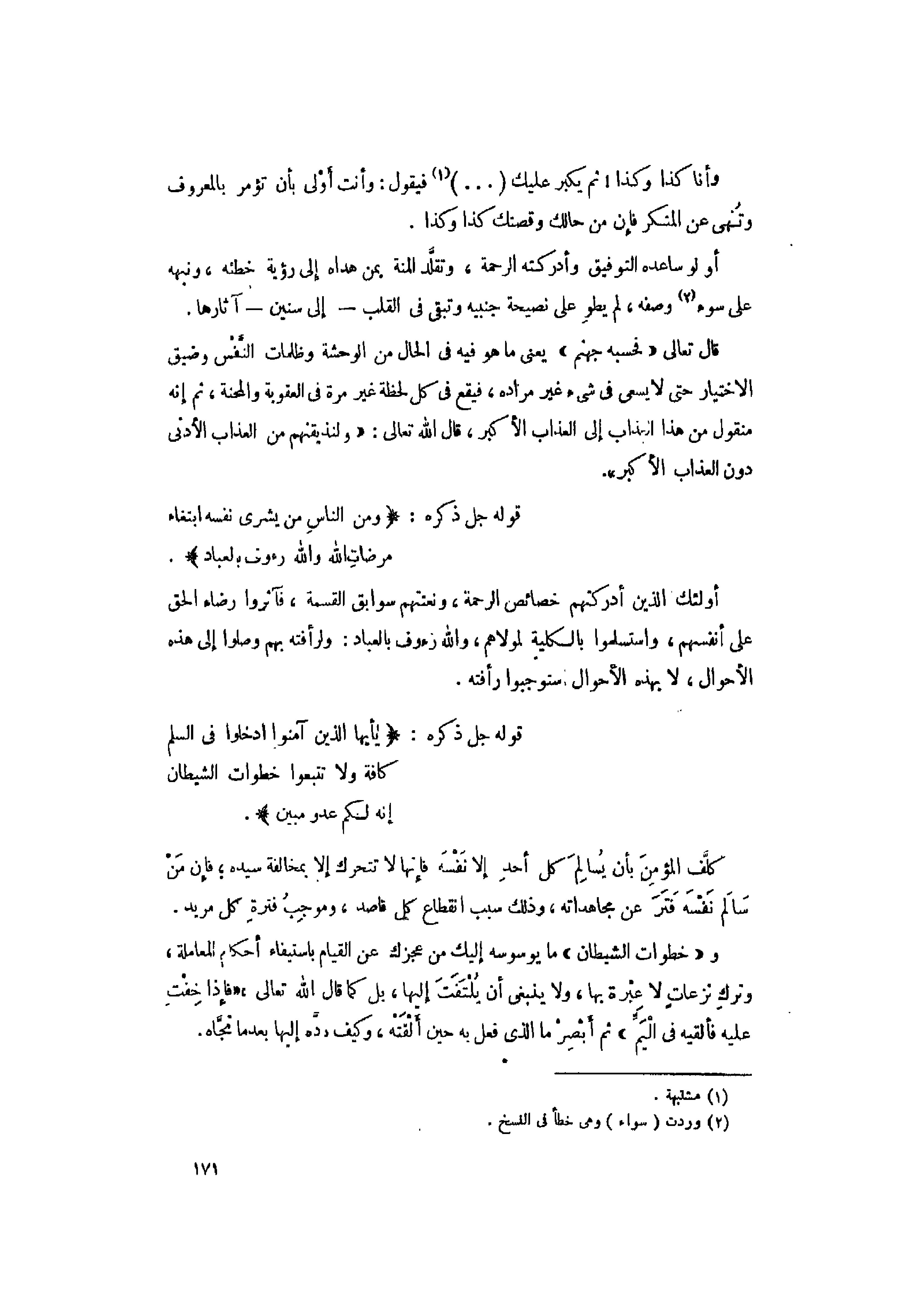 و «خطوات الشيطان» ما يوسوسه إليك من عجزك عن القيام باستيفاء أحكام المعاملة، وترك نزعات لا عبرة بها، ولا ينبغى أن يلتفت إليها، بل كما قال الله تعالى: «فَإِذا خِفْتِ عَلَيْهِ فَأَلْقِيهِ فِي الْيَمِّ» ثم أبصر ما الذي فعل به حين ألقته، وكيف مدّه إليها بعد ما نجّاه.