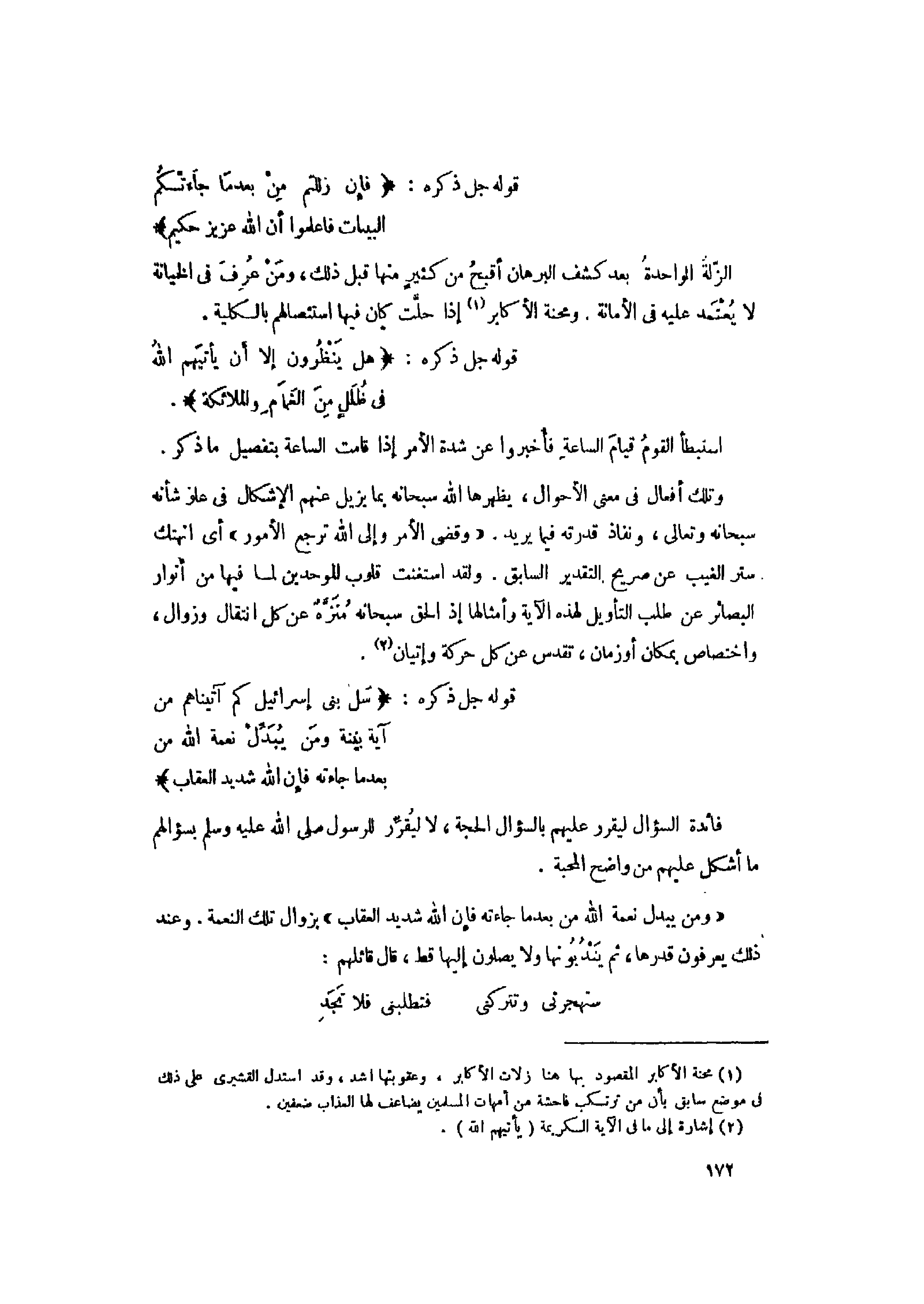 وتلك أفعال فى معنى الأحوال، يظهرها الله سبحانه بما يزيل عنهم الإشكال فى علو شأنه سبحانه وتعالى، ونفاذ قدرته فيما يريد. «وَقُضِيَ الْأَمْرُ وَإِلَى اللَّهِ تُرْجَعُ الْأُمُورُ» أي انهتك ستر الغيب عن صريح التقدير السابق. ولقد استغنت قلوب الموحدين لما فيها من أنوار البصائر عن طلب التأويل لهذه الآية وأمثالها إذ الحق سبحانه منزّه عن كل انتقال وزوال، واختصاص بمكان أو زمان، تقدس عن كل حركة وإتيان «2» .