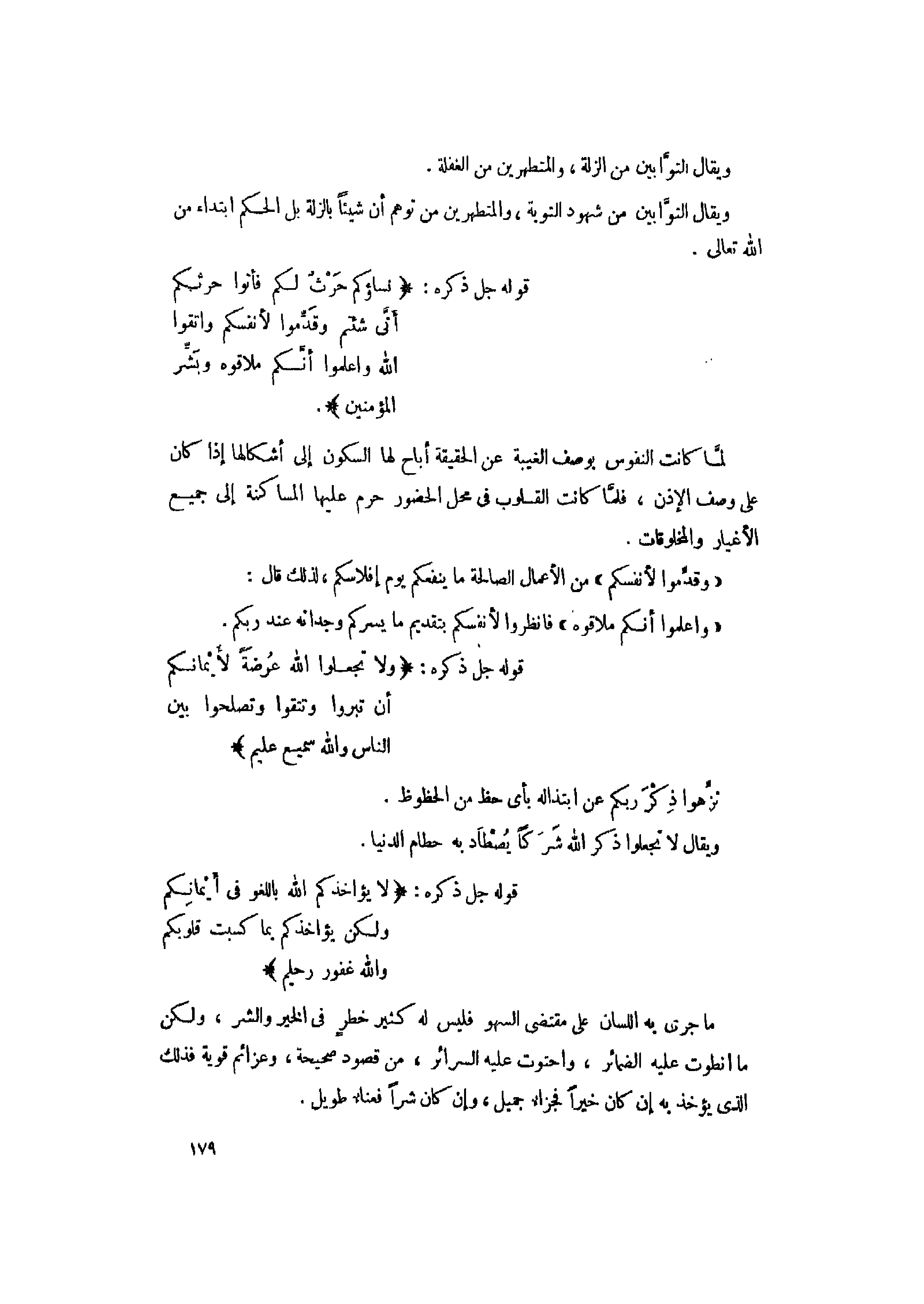 ما جرى به اللسان على مقتضى السهو فليس له كثير خطر فى الخير والشر، ولكن ما انطوت عليه الضمائر، واحتوت عليه السرائر، من قصود صحيحة، وعزائم قوية فذلك الذي يؤخذ به إن كان خيرا فجزاء جميل، وإن كان شرا فعناء طويل.