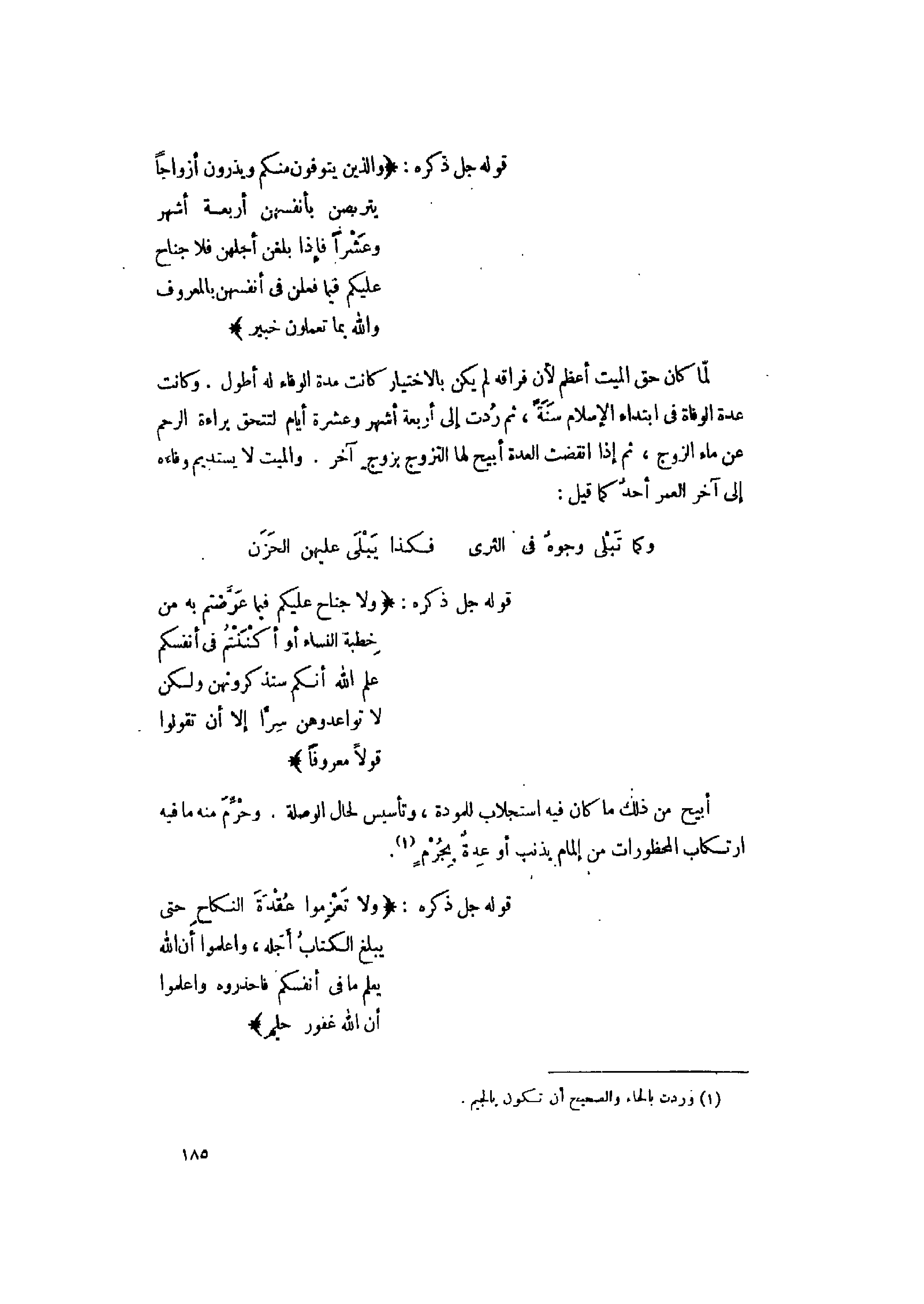 وَلا جُناحَ عَلَيْكُمْ فِيما عَرَّضْتُمْ بِهِ مِنْ خِطْبَةِ النِّساءِ أَوْ أَكْنَنْتُمْ فِي أَنْفُسِكُمْ عَلِمَ اللَّهُ أَنَّكُمْ سَتَذْكُرُونَهُنَّ وَلكِنْ لا تُواعِدُوهُنَّ سِرًّا إِلاَّ أَنْ تَقُولُوا قَوْلاً مَعْرُوفاً وَلا تَعْزِمُوا عُقْدَةَ النِّكاحِ حَتَّى يَبْلُغَ الْكِتابُ أَجَلَهُ وَاعْلَمُوا أَنَّ اللَّهَ يَعْلَمُ ما فِي أَنْفُسِكُمْ فَاحْذَرُوهُ وَاعْلَمُوا أَنَّ اللَّهَ غَفُورٌ حَلِيمٌ (235)
