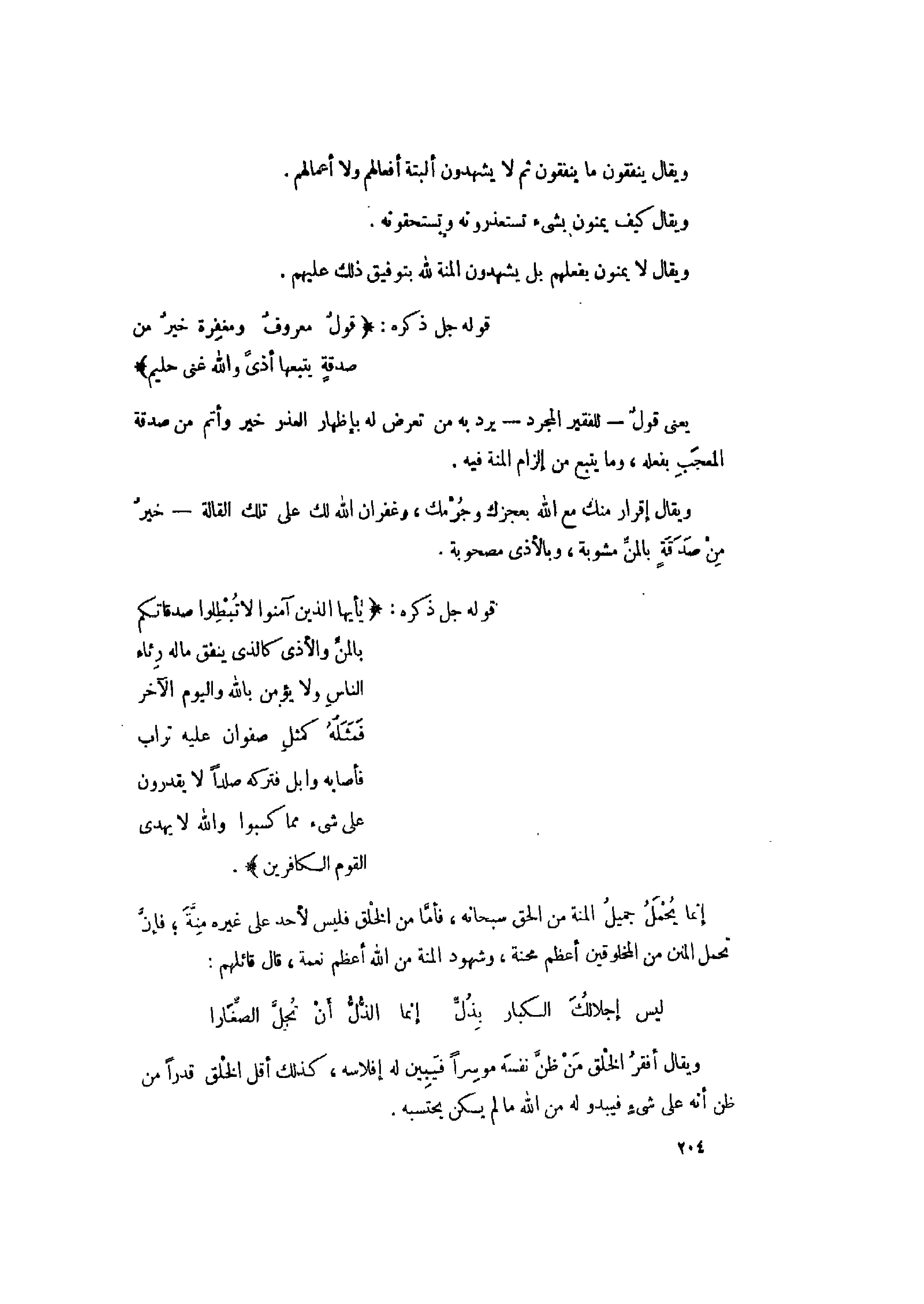 يا أَيُّهَا الَّذِينَ آمَنُوا لا تُبْطِلُوا صَدَقاتِكُمْ بِالْمَنِّ وَالْأَذى كَالَّذِي يُنْفِقُ مالَهُ رِئاءَ النَّاسِ وَلا يُؤْمِنُ بِاللَّهِ وَالْيَوْمِ الْآخِرِ فَمَثَلُهُ كَمَثَلِ صَفْوانٍ عَلَيْهِ تُرابٌ فَأَصابَهُ وابِلٌ فَتَرَكَهُ صَلْداً لا يَقْدِرُونَ عَلى شَيْءٍ مِمَّا كَسَبُوا وَاللَّهُ لا يَهْدِي الْقَوْمَ الْكافِرِينَ (264)