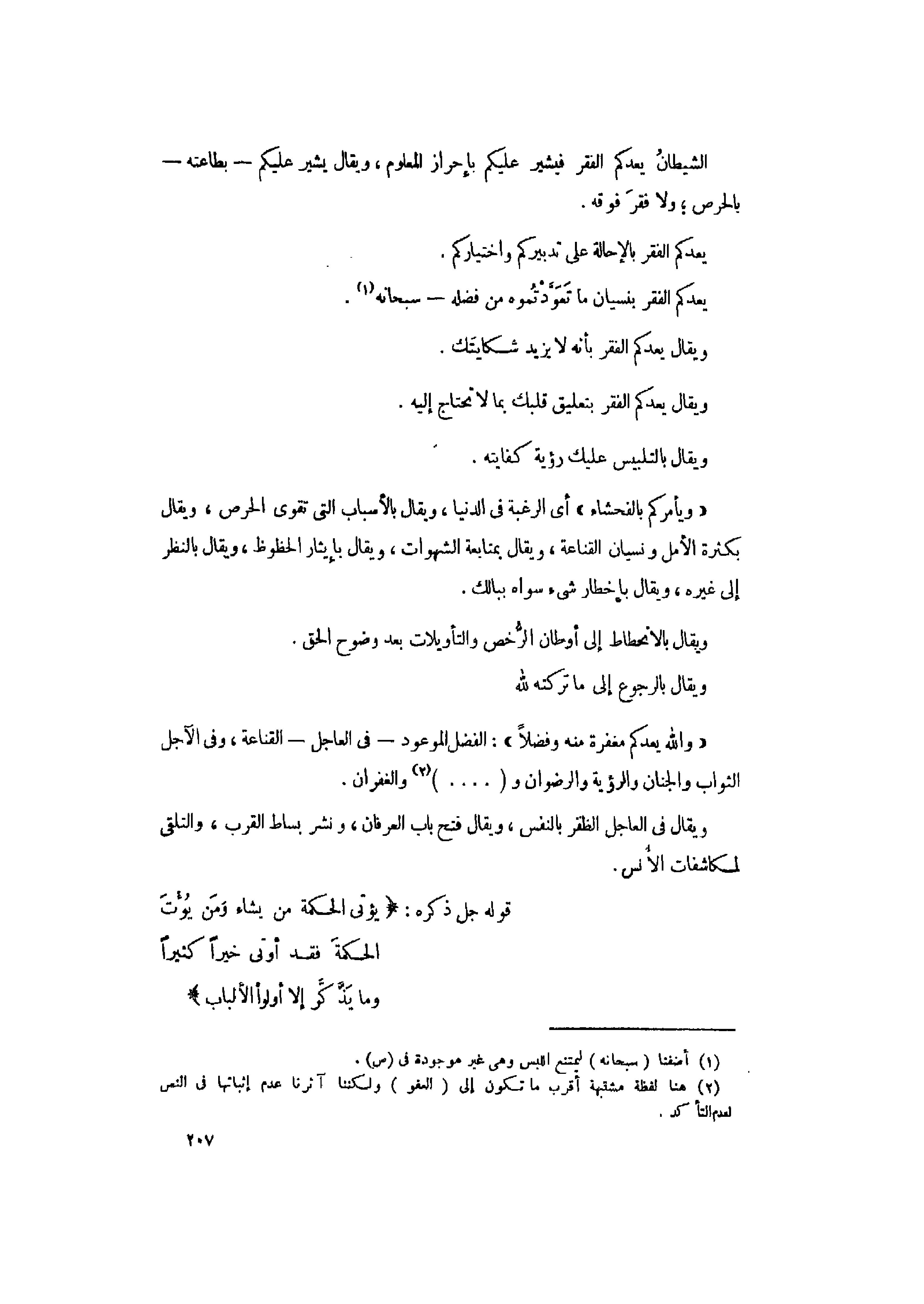 «وَاللَّهُ يَعِدُكُمْ مَغْفِرَةً مِنْهُ وَفَضْلًا» : الفضل الموعود- فى العاجل- القناعة، وفى الآجل الثواب والجنان والرؤية والرضوان و (....) «2» والغفران.