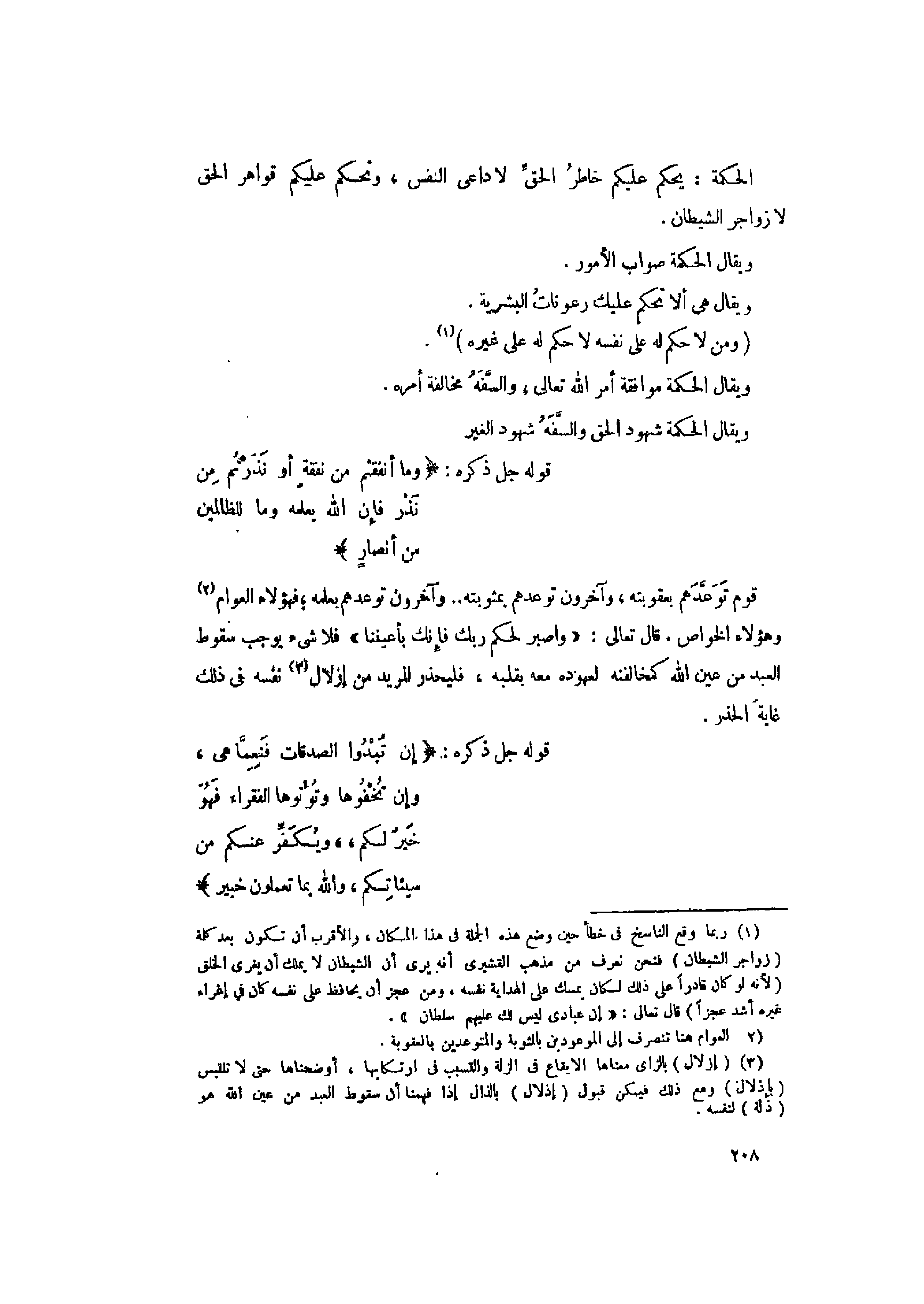 (1) ربما وقع الناسخ فى خطأ حين وضع هذه الجملة فى هذا المكان، والأقرب أن تكون بعد كلمة (زواجر الشيطان) فنحن نعرف من مذهب القشيري أنه يرى أن الشيطان لا يملك أن يغرى الخلق (لأنه لو كان قادرا على ذلك لكان يمسك على الهداية نفسه، ومن عجز أن يحافظ على نفسه كان في إغراء غيره أشد عجزا) قال تعالى: «إِنَّ عِبادِي لَيْسَ لَكَ عَلَيْهِمْ سُلْطانٌ» .