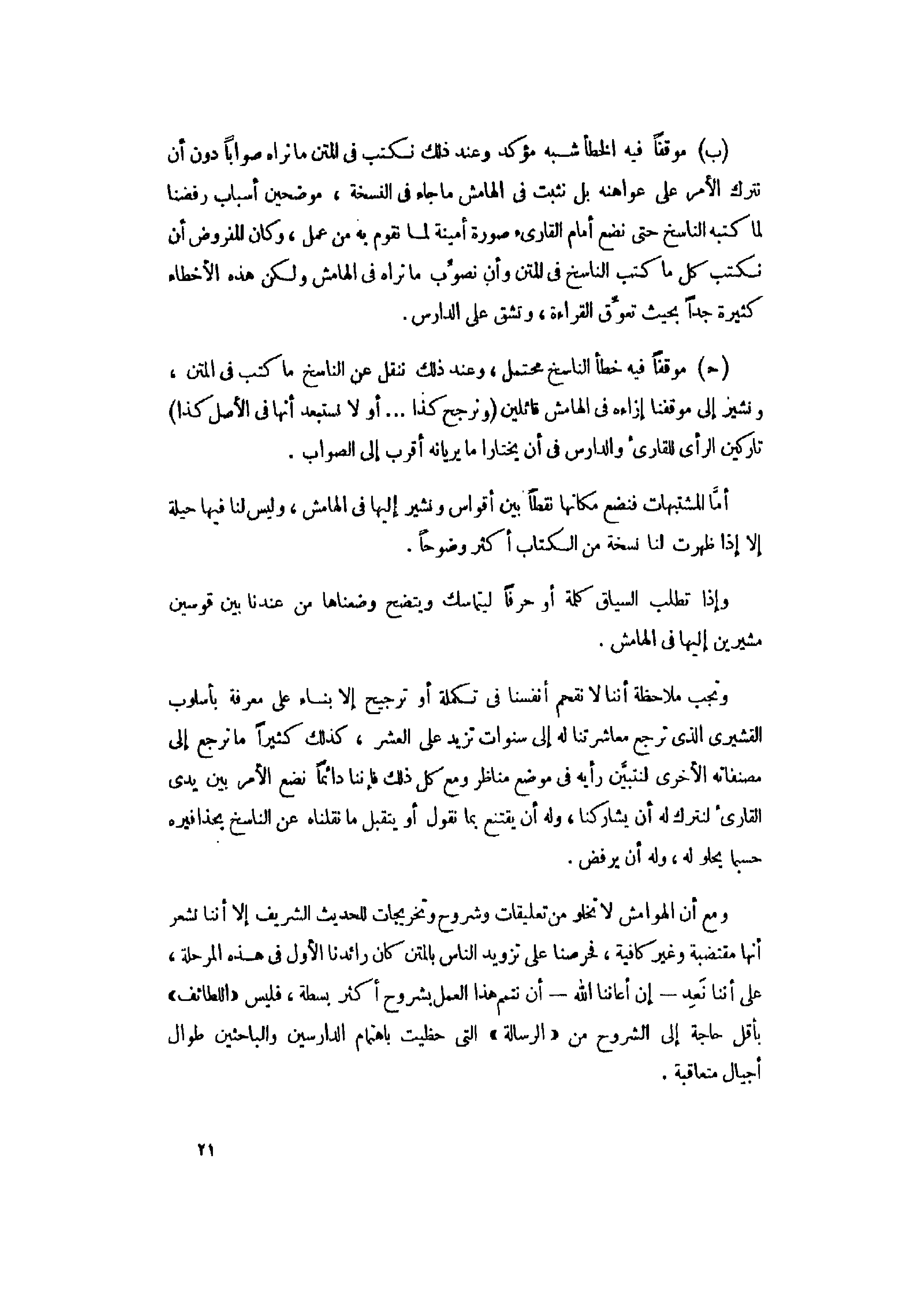 (ب) موقفا فيه الخطأ شبه مؤكد وعند ذلك نكتب فى المتن ما نراه صوابا دون أن نترك الأمر على عواهنه بل نثبت فى الهامش ما جاء فى النسخة، موضحين أسباب رفضنا لما كتبه الناسخ حتى نضع أمام القارئ صورة أمينة لما نقوم به من عمل، وكان المفروض أن نكتب كل ما كتب الناسخ فى المتن وأن نصوّب ما نراه فى الهامش ولكن هذه الأخطاء كثيرة جدا بحيث تعوّق القراءة، وتشق على الدارس.