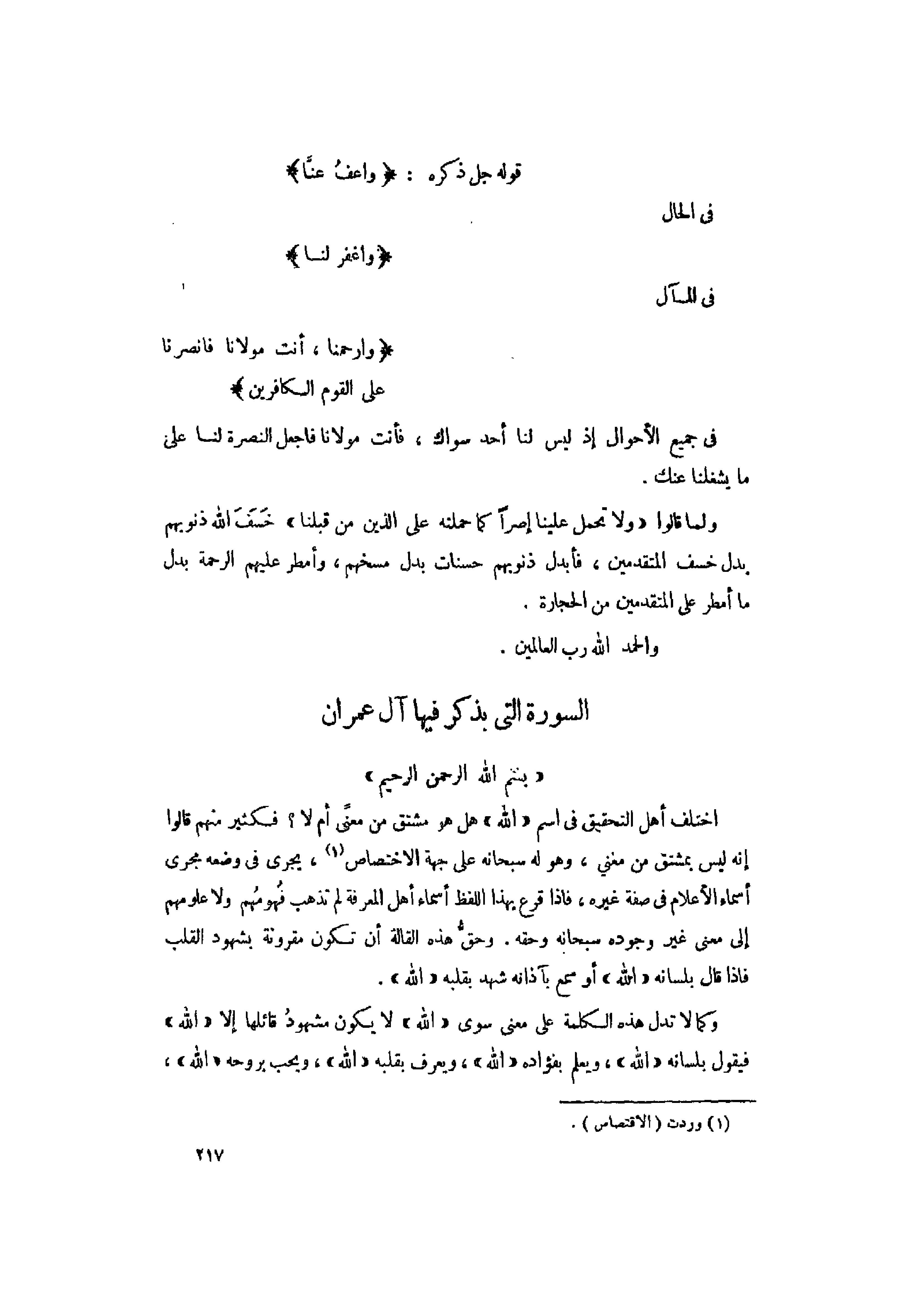 قوله جل ذكره: وَاعْفُ عَنَّا فى الحال وَاغْفِرْ لَنا فى المآل وَارْحَمْنا، أَنْتَ مَوْلانا فَانْصُرْنا عَلَى الْقَوْمِ الْكافِرِينَ.