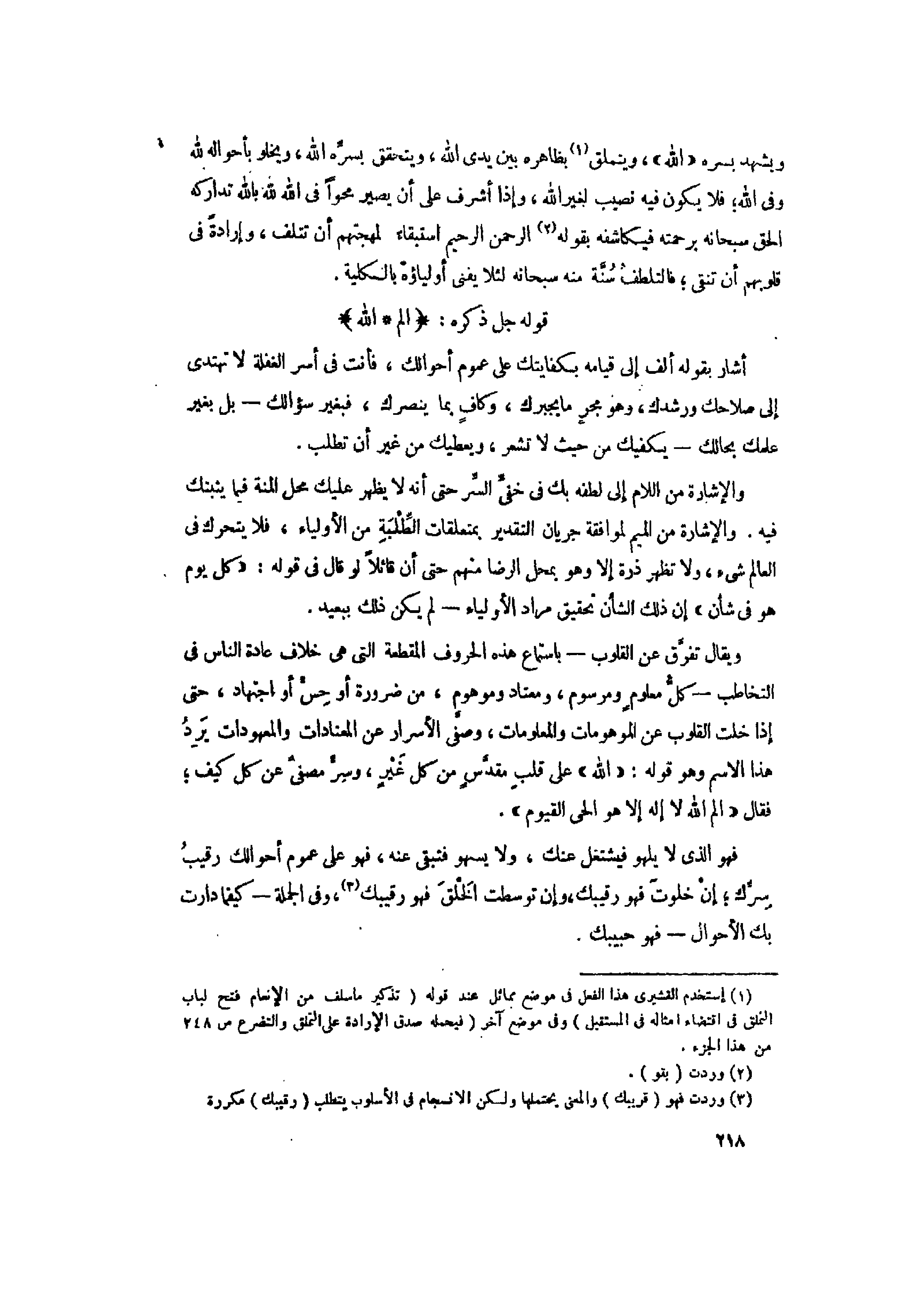 ويشهد بسره «الله» ، ويتملق «1» بظاهره بين يدى الله، ويتحقق بسرّه الله، ويخلو بأحواله لله وفى الله فلا يكون فيه نصيب لغير الله، وإذا أشرف على أن يصير محوا فى الله لله بالله تداركه الحق سبحانه برحمته فيكاشفه بقوله «2» الرحمن الرحيم استبقاء لمهجتهم أن تتلف، وإرادة فى قلوبهم أن تنقى فالتلطف سنّة منه سبحانه لئلا يفنى أولياؤه بالكلية.