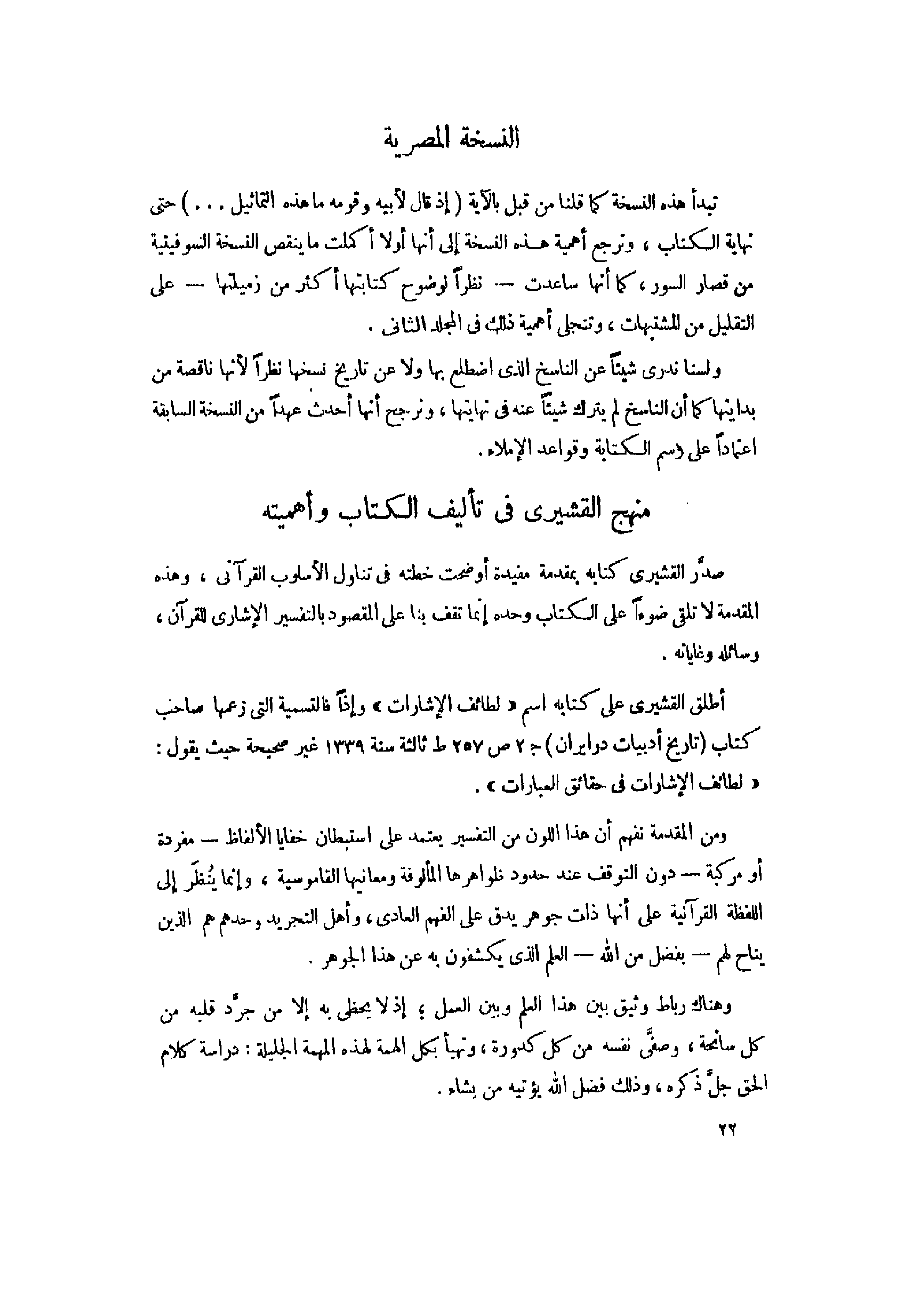 صدّر القشيري كتابه بمقدمة مفيدة أوضحت خطته فى تناول الأسلوب القرآنى، وهذه المقدمة لا تلقى ضوءا على الكتاب وحده إنما تقف بنا على المقصود بالتفسير الإشارى للقرآن، وسائله وغاياته.