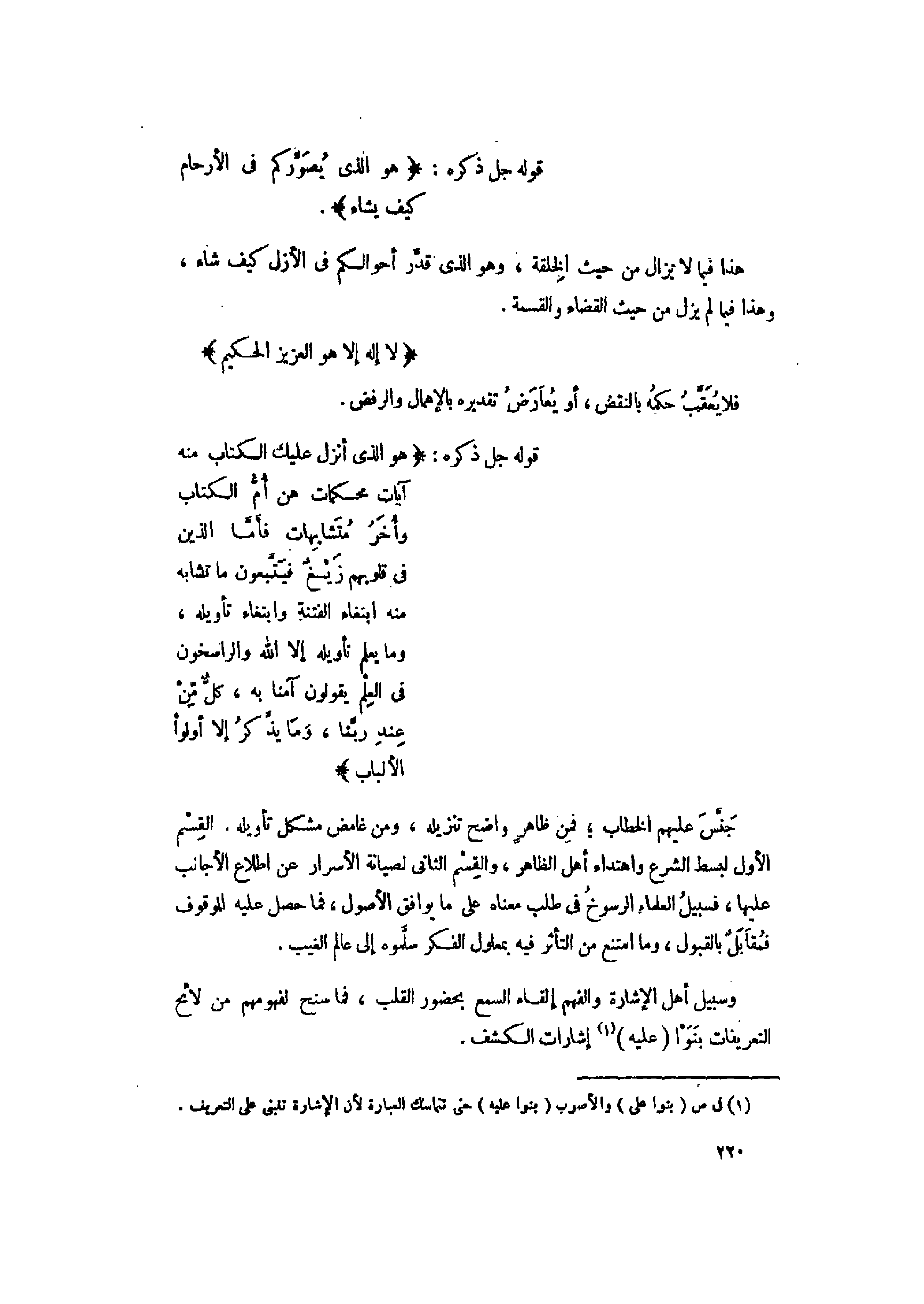 جنّس عليهم الخطاب فمن ظاهر واضح تنزيله، ومن غامض مشكل تأويله. القسم الأول لبسط الشرع واهتداء أهل الظاهر، والقسم الثاني لصيانة الأسرار عن اطلاع الأجانب عليها، فسبيل العلماء الرسوخ فى طلب معناه على ما يوافق الأصول، فما حصل عليه الموقوف فمقابل بالقبول، وما امتنع من التأثر فيه بمعلول الفكر سلّموه إلى عالم الغيب.