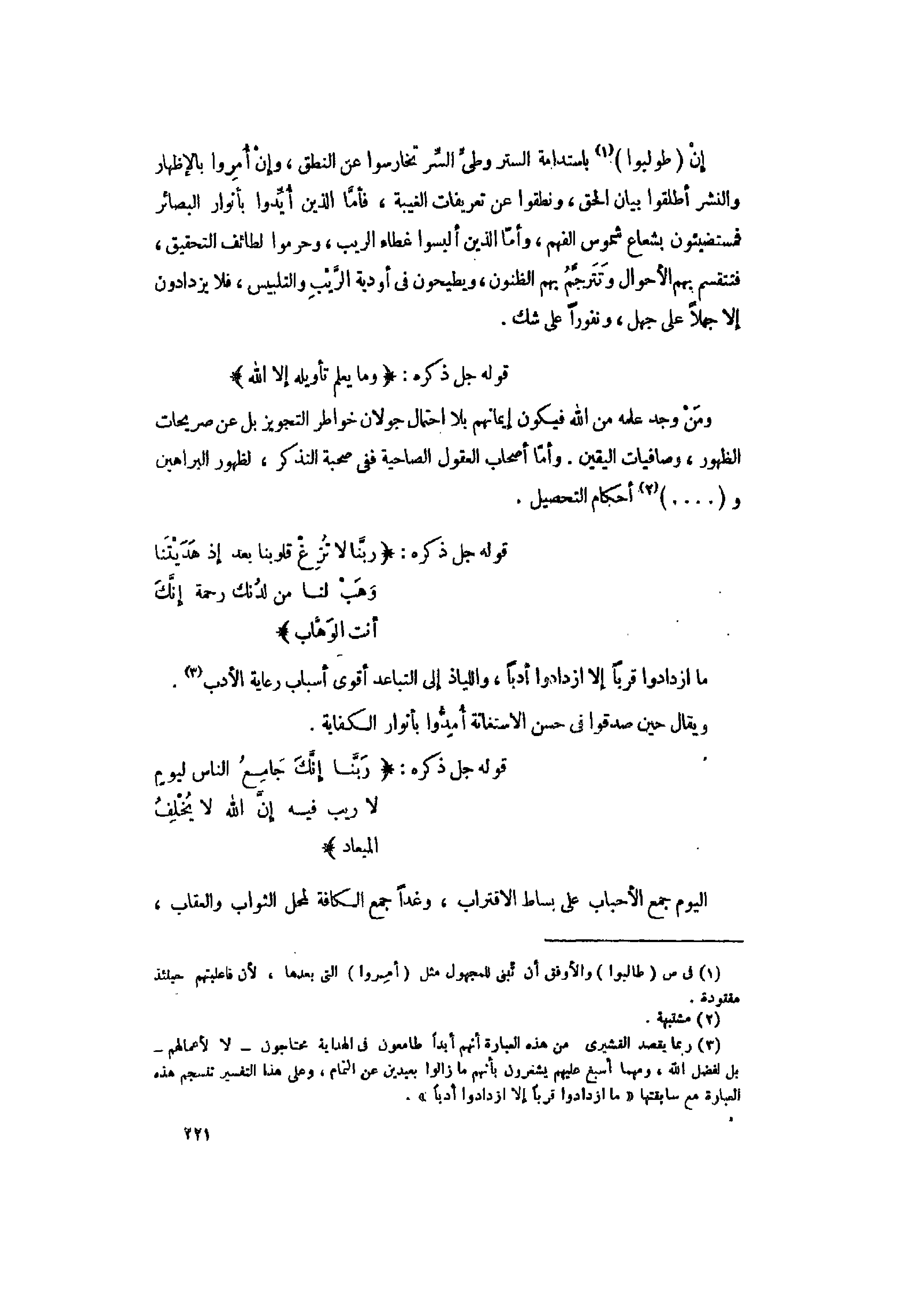 إن (طولبوا) «1» باستدامة الستر وطىّ السّر تخارسوا عن النطق، وإن أمروا بالإظهار والنشر أطلقوا بيان الحق، ونطقوا عن تعريفات الغيبة، فأمّا الذين أيّدوا بأنوار البصائر فمستضيئون بشعاع شموس الفهم، وأمّا الذين ألبسوا غطاء الريب، وحرموا لطائف التحقيق، فتنقسم بهم الأحوال وتترجّم بهم الظنون، ويطيحون فى أودية الرّيب والتلبيس، فلا يزدادون إلا جهلا على جهل، ونفورا على شك.