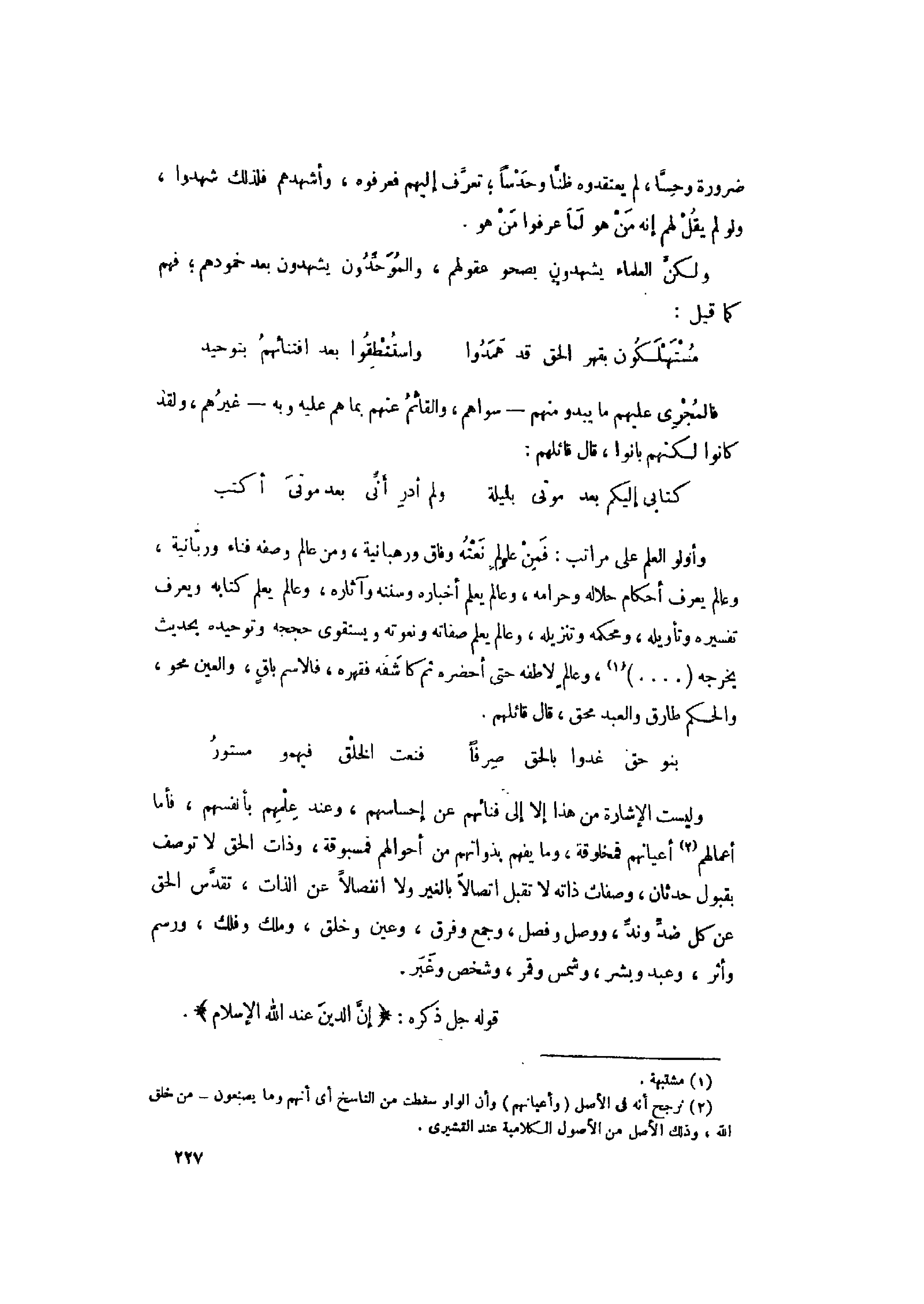 وأولو العلم على مراتب: فمن عالم نعته وفاق ورهبانية، ومن عالم وصفه فناء وربّانية، وعالم يعرف أحكام حلاله وحرامه، وعالم يعلم أخباره وسننه وآثاره، وعالم يعلم كتابه ويعرف تفسيره وتأويله، ومحكمه وتنزيله، وعالم يعلم صفاته ونعوته ويستقوى حججه وتوحيده بحديث يخرجه (....) «1» ، وعالم لاطفه حتى أحضره ثم كاشفه فقهره، فالاسم باق، والعين محو، والحكم طارق والعبد محق، قال قائلهم.