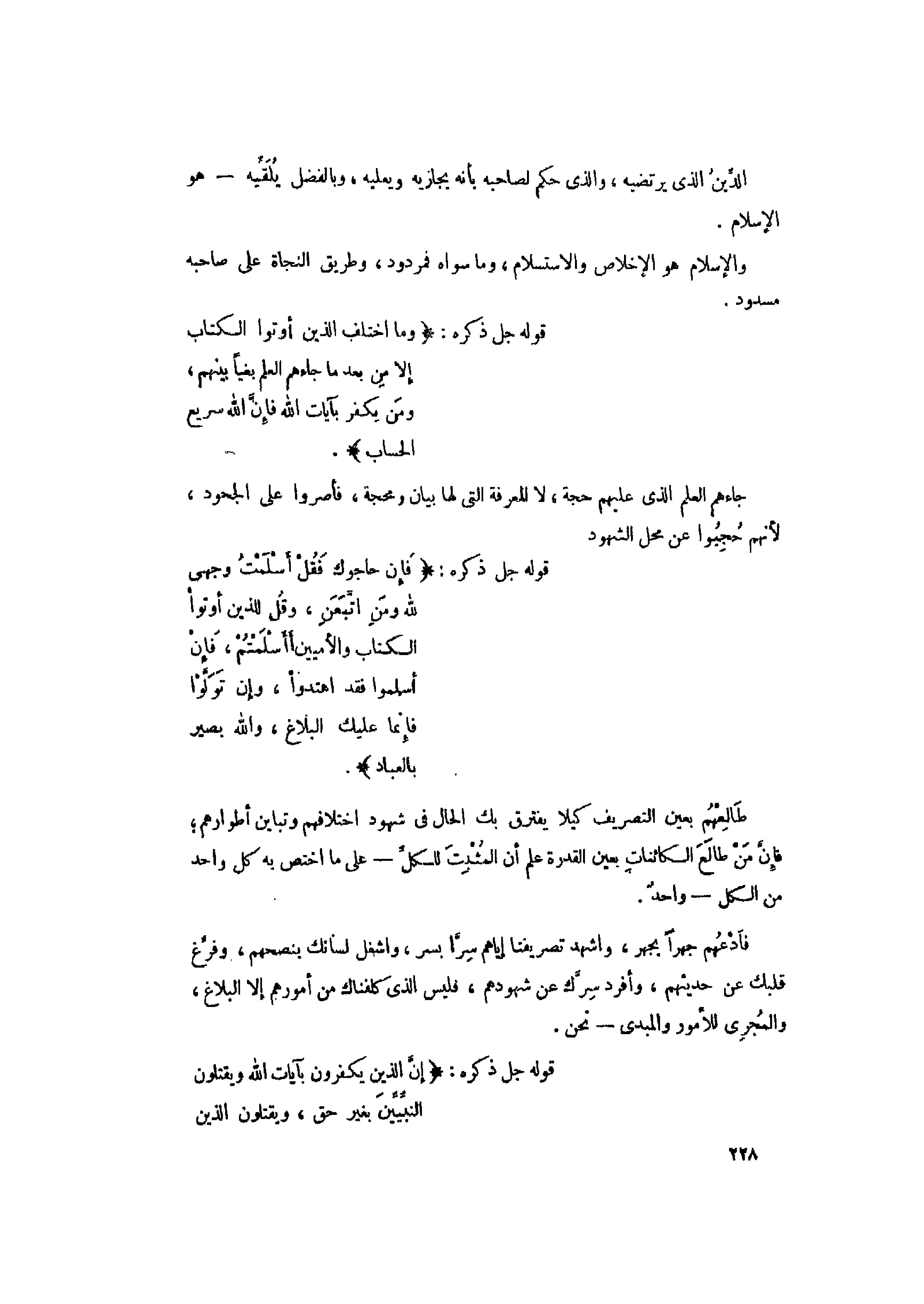 قوله جل ذكره: وَمَا اخْتَلَفَ الَّذِينَ أُوتُوا الْكِتابَ إِلَّا مِنْ بَعْدِ ما جاءَهُمُ الْعِلْمُ بَغْياً بَيْنَهُمْ، وَمَنْ يَكْفُرْ بِآياتِ اللَّهِ فَإِنَّ اللَّهَ سَرِيعُ الْحِسابِ.