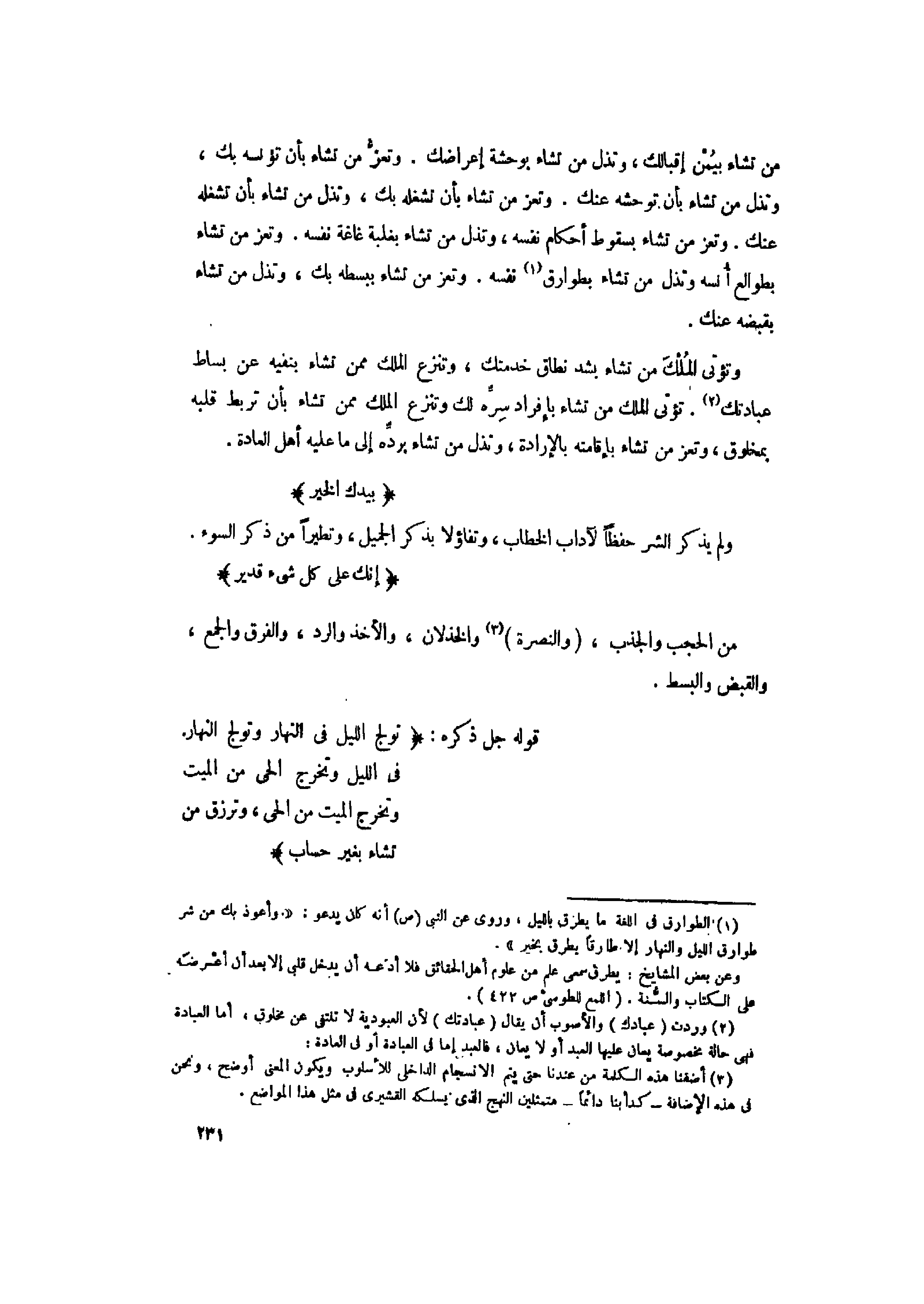 (2) وردت (عبادك) والأصوب أن يقال (عبادتك) لأن العبودية لا تنتفى عن مخلوق، أما العبادة فهى حالة مخصوصة يعان عليها العبد أو لا يعان، فالعبد إما فى العبادة أو فى العادة: