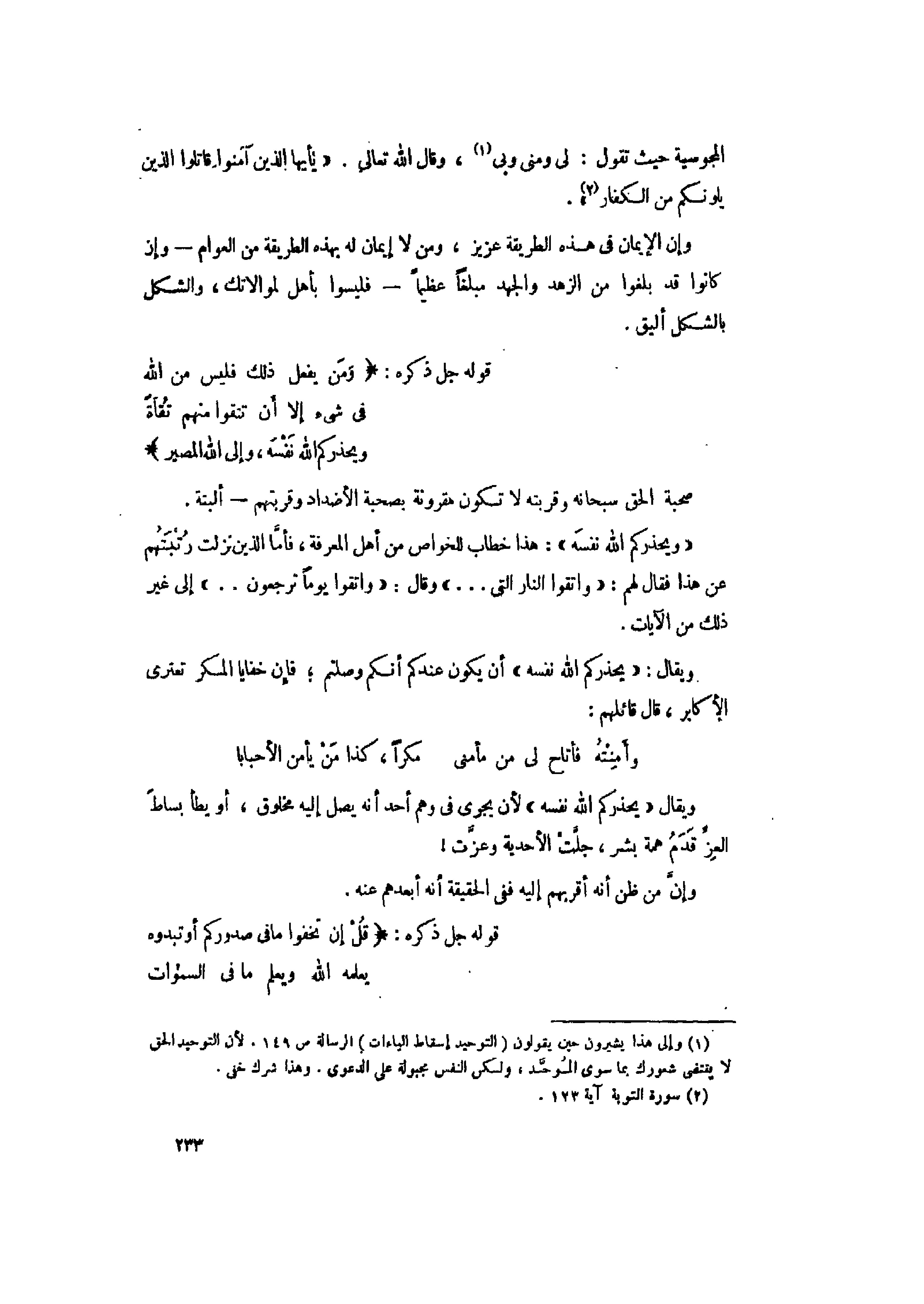 (1) وإلى هذا يشيرون حين يقولون (التوحيد إسقاط الياءات) الرسالة ص 149. لأن التوحيد الحق لا يقتضى شعورك بما سوى الموحّد، ولكن النفس مجبولة على الدعوى. وهذا شرك خفى.