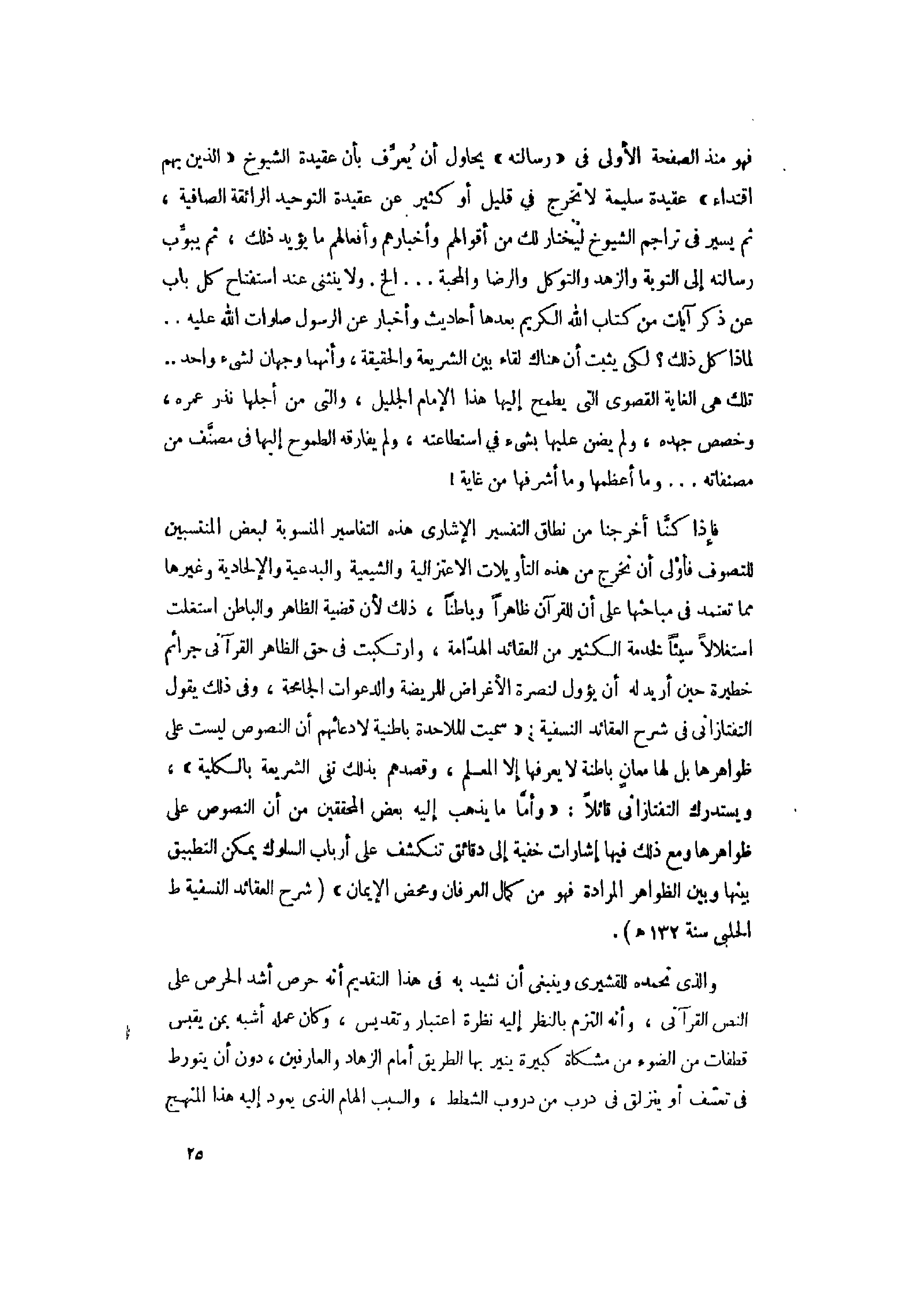 تلك هى الغاية القصوى التي يطمح إليها هذا الإمام الجليل، والتي من أجلها نذر عمره، وخصص جهده، ولم يضن عليها بشىء في استطاعته، ولم يفارقه الطموح إليها فى مصنّف من مصنفاته ... وما أعظمها وما أشرفها من غاية! فإذا كنّا أخرجنا من نطاق التفسير الإشارى هذه التفاسير المنسوبة لبعض المنتسبين للتصوف فأولى أن نخرج من هذه التأويلات الاعتزالية والشيعية والبدعية والإلحادية وغيرها مما تعتمد فى مباحثها على أن للقرآن ظاهرا وباطنا، ذلك لأن قضية الظاهر والباطن استغلت استغلالا سيئا لخدمة الكثير من العقائد الهدّامة، وارتكبت فى حق الظاهر القرآنى جرائم خطيرة حين أريد له أن يؤول لنصرة الأغراض المريضة والدعوات الجامحة، وفى ذلك يقول التفتازانيّ فى شرح العقائد النسفية: «سميت الملاحدة باطنية لا دعائهم أن النصوص ليست على ظواهرها بل لها معان باطنة لا يعرفها إلا المعلم، وقصدهم بذلك نفى الشريعة بالكلية» ، ويستدرك التفتازانيّ قائلا: «وأمّا ما يذهب إليه بعض المحققين من أن النصوص على ظواهرها ومع ذلك فيها إشارات خفية إلى دقائق تنكشف على أرباب السلوك يمكن التطبيق بينها وبين الظواهر المرادة فهو من كمال العرفان ومحض الإيمان» (شرح العقائد النسفية ط الحلبي سنة 132 هـ) .