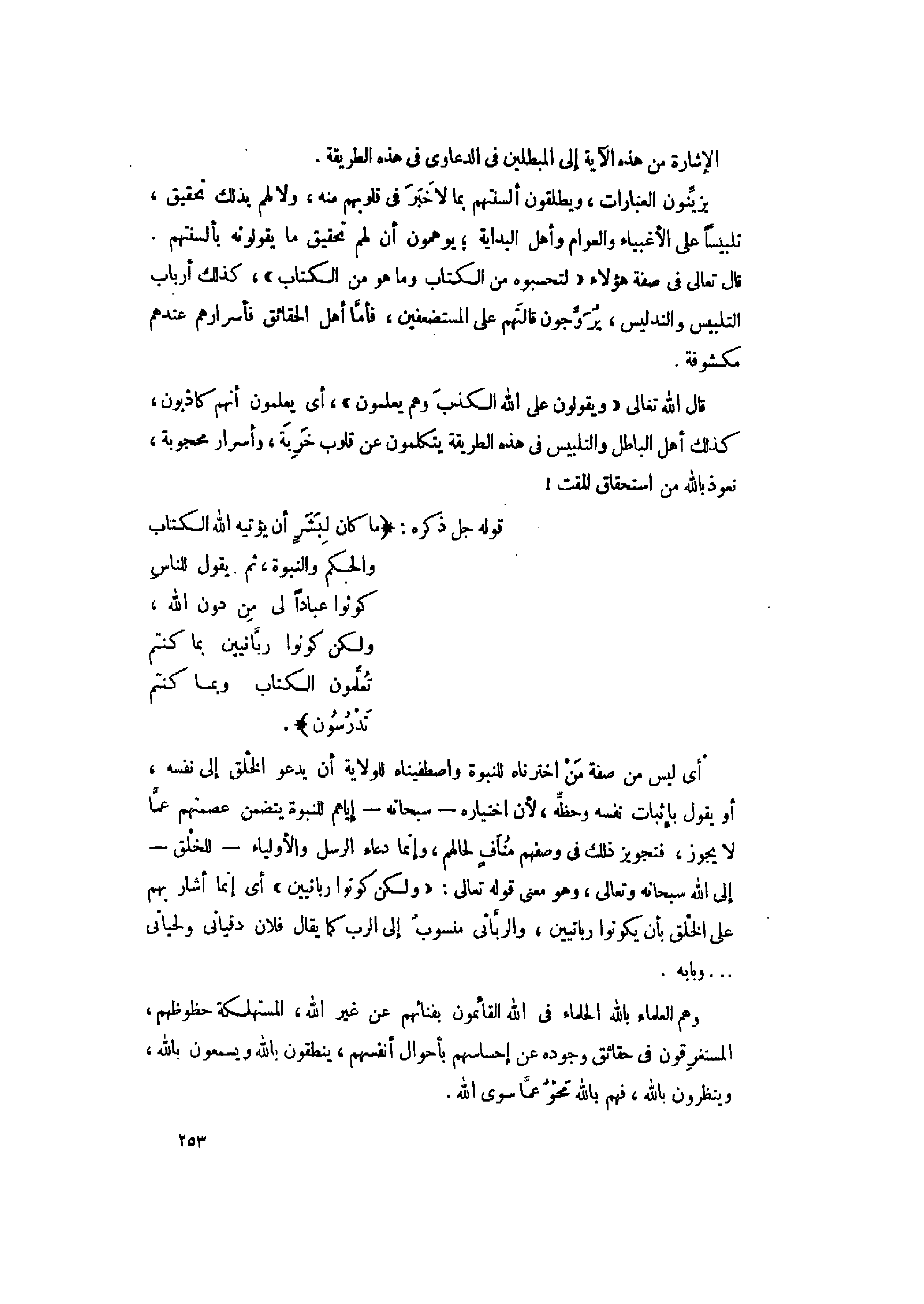 ما كانَ لِبَشَرٍ أَنْ يُؤْتِيَهُ اللَّهُ الْكِتابَ وَالْحُكْمَ وَالنُّبُوَّةَ ثُمَّ يَقُولَ لِلنَّاسِ كُونُوا عِباداً لِي مِنْ دُونِ اللَّهِ وَلكِنْ كُونُوا رَبَّانِيِّينَ بِما كُنْتُمْ تُعَلِّمُونَ الْكِتابَ وَبِما كُنْتُمْ تَدْرُسُونَ (79)