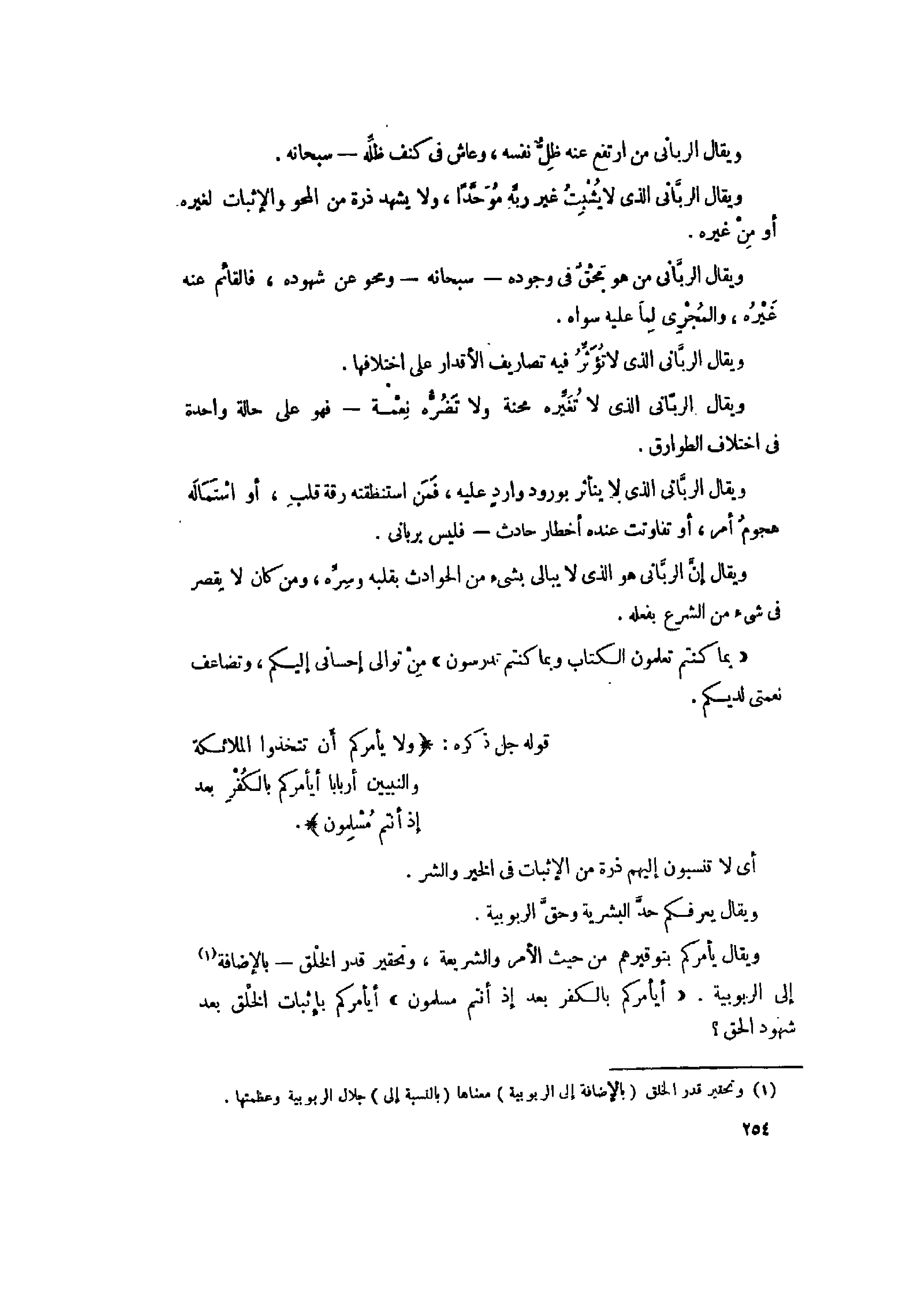 ويقال إنّ الربّاني هو الذي لا يبالى بشىء من الحوادث بقلبه وسرّه، ومن كان لا يقصر فى شىء من الشرع بفعله.