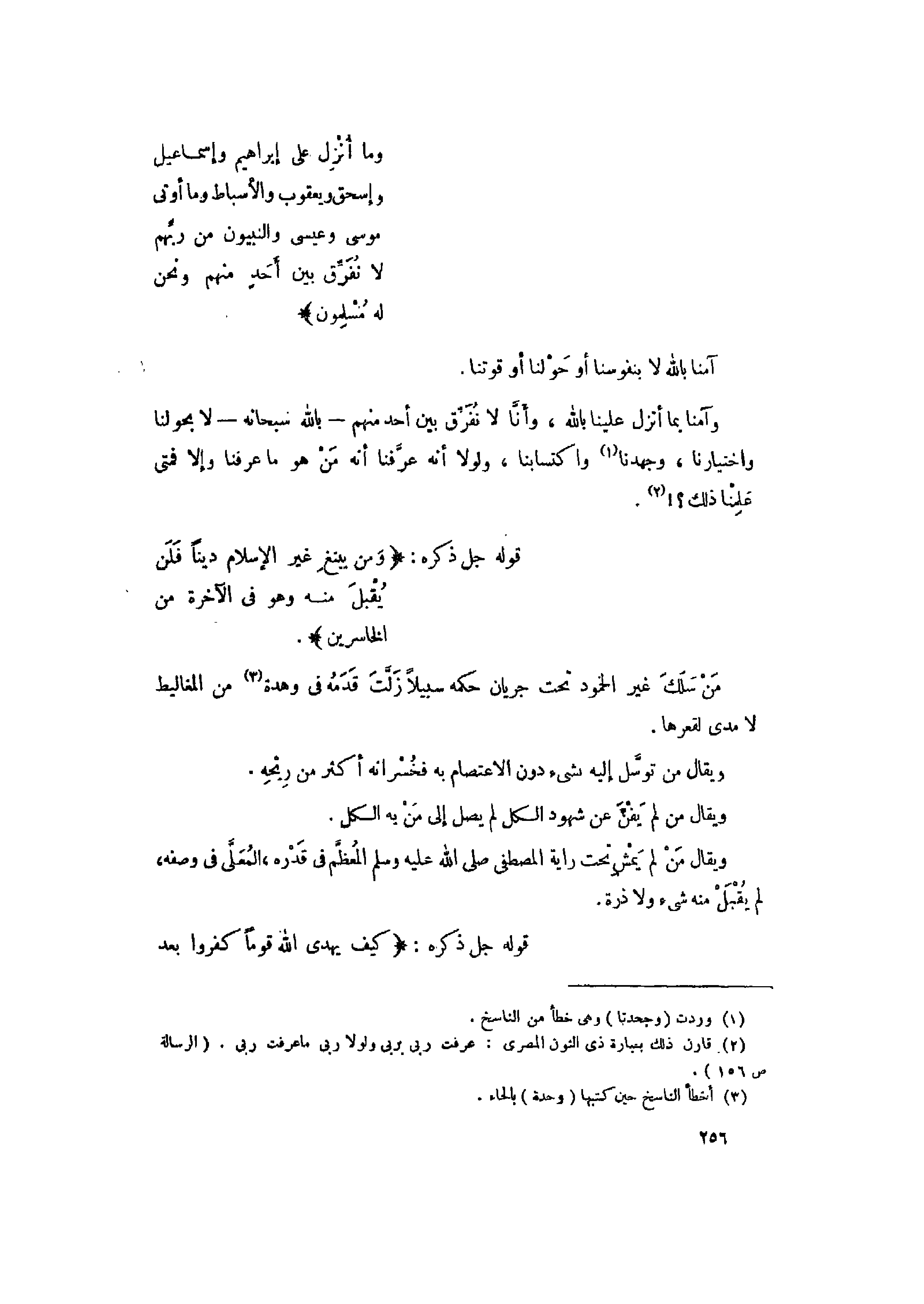 وآمنا بما أنزل علينا بالله، وأنّا لا نفرّق بين أحد منهم- بالله سبحانه- لا بحولنا واختيارنا، وجهدنا «1» واكتسابنا، ولولا أنه عرّفنا أنه من هو ما عرفنا وإلا فمتى علمنا ذلك؟! «2» .
