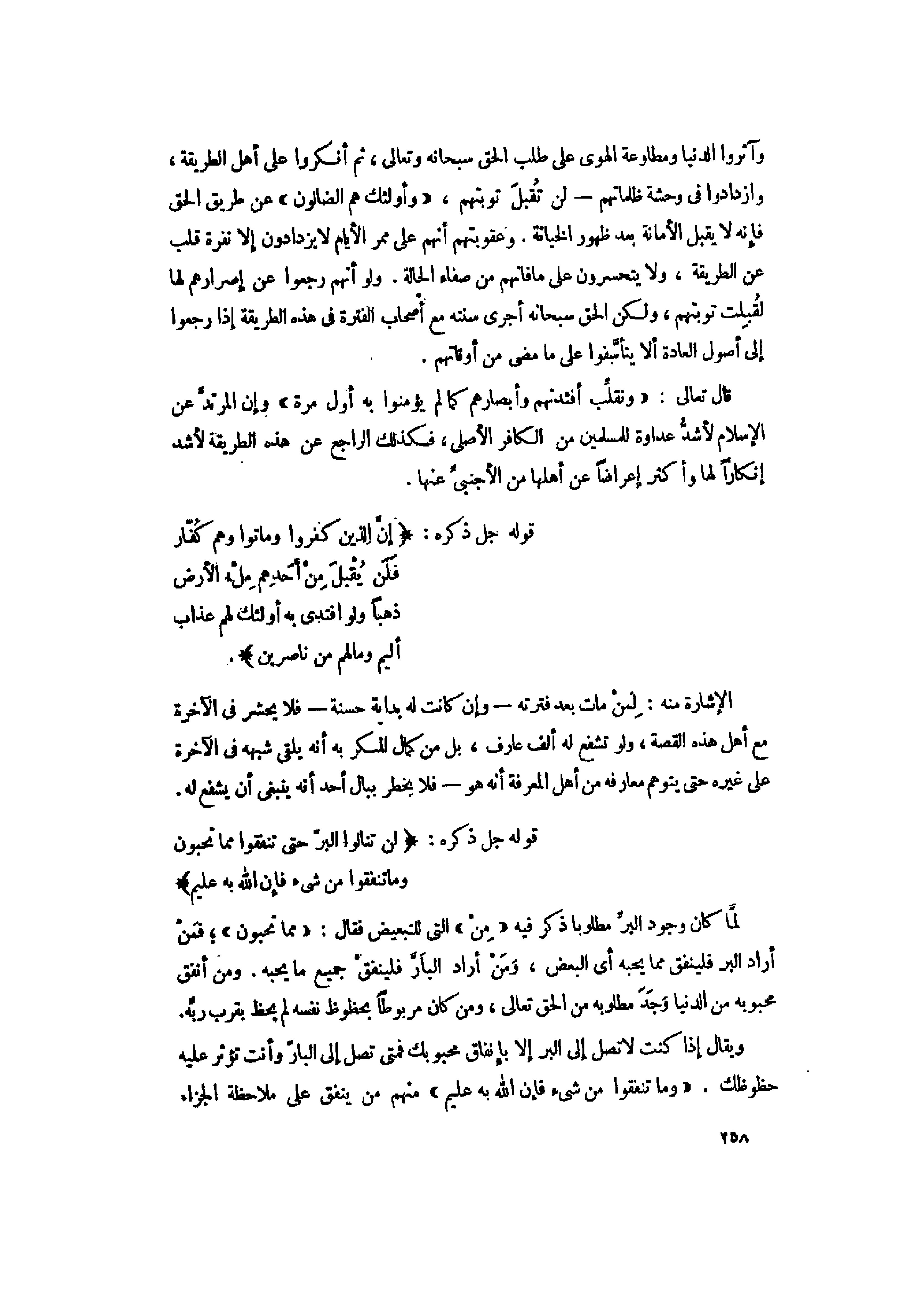 وآثروا الدنيا ومطاوعة الهوى على طلب الحق سبحانه وتعالى، ثم أنكروا على أهل الطريقة، وازدادوا فى وحشة ظلماتهم- لن تقبل توبتهم، «وَأُولئِكَ هُمُ الضَّالُّونَ» عن طريق الحق فإنه لا يقبل الأمانة بعد ظهور الخيانة. وعقوبتهم أنهم على ممر الأيام لا يزدادون إلا نفرة قلب عن الطريقة، ولا يتحسرون على ما فاتهم من صفاء الحالة. ولو أنهم رجعوا عن إصرارهم لها لقبلت توبتهم، ولكن الحق سبحانه أجرى سنته مع أصحاب الفترة فى هذه الطريقة إذا رجعوا إلى أصول العادة ألا يتأسّفوا على ما مضى من أوقاتهم.