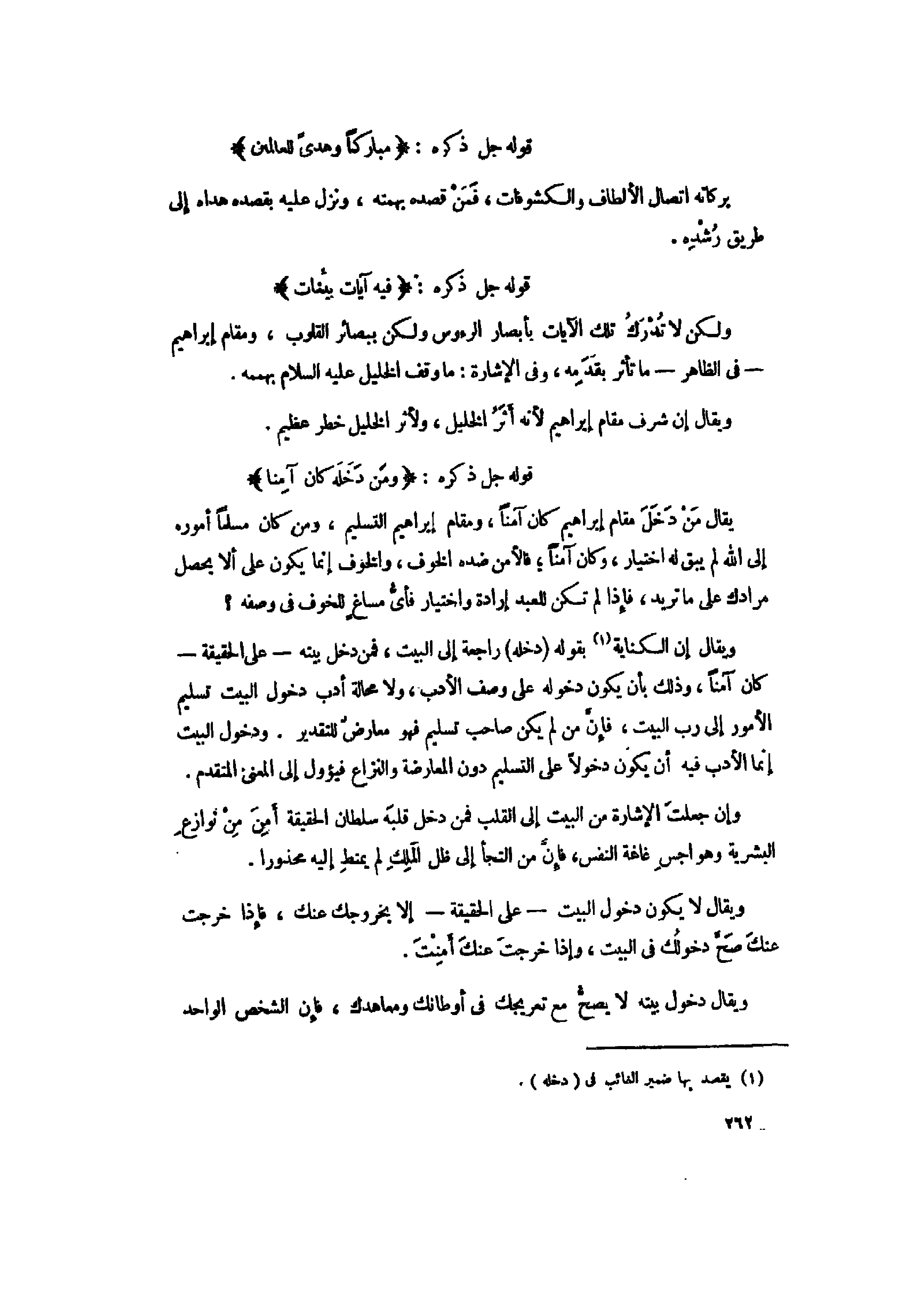 ويقال إن الكناية «1» بقوله (دخله) راجعة إلى البيت، فمن دخل بيته- على الحقيقة- كان آمنا، وذلك بأن يكون دخوله على وصف الأدب، ولا محالة أدب دخول البيت تسليم الأمور إلى رب البيت، فإنّ من لم يكن صاحب تسليم فهو معارض للتقدير. ودخول البيت إنما الأدب فيه أن يكون دخولا على التسليم دون المعارضة والنزاع فيؤول إلى المعنى المتقدم.