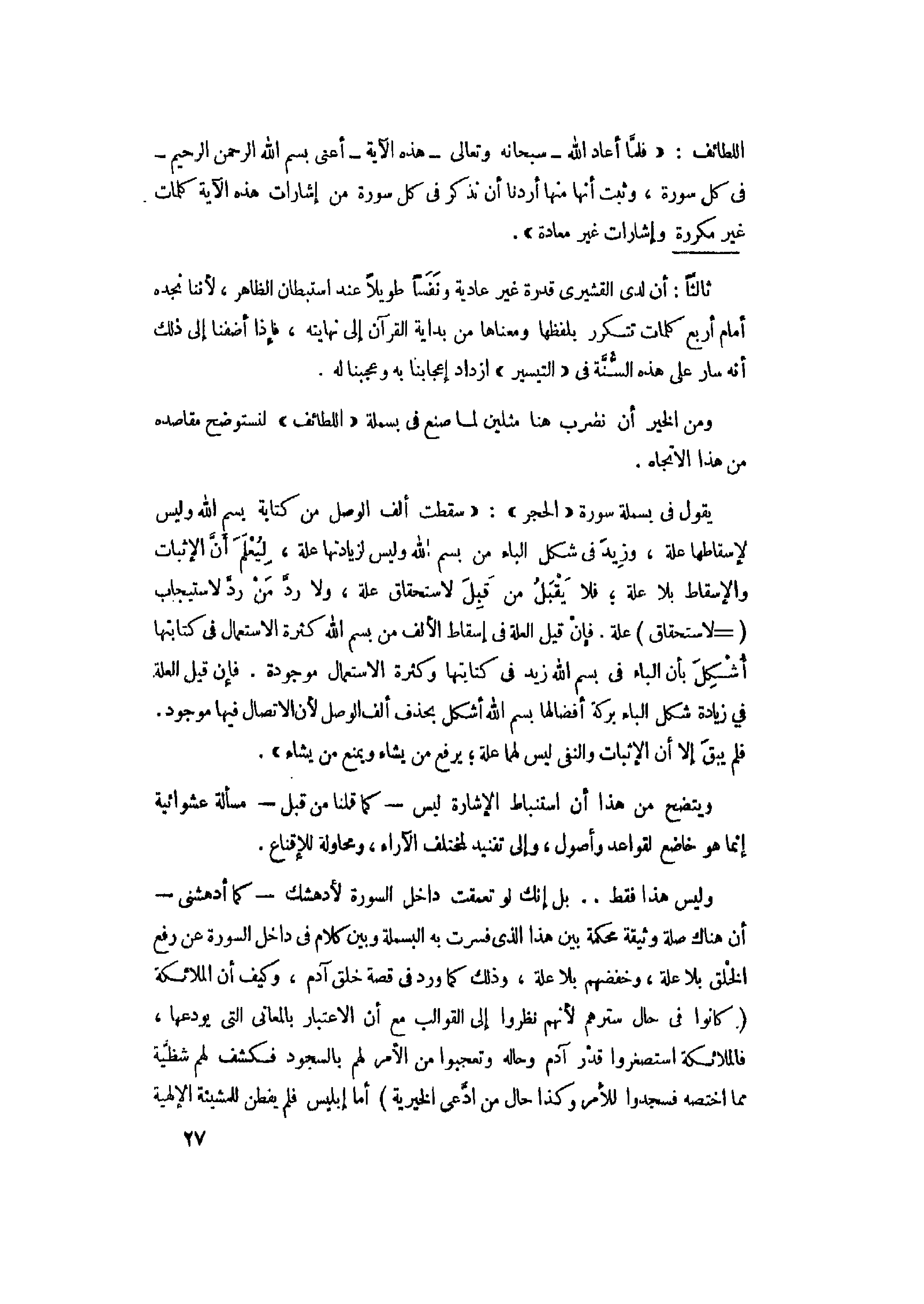 ومن الخير أن نضرب هنا مثلين لما صنع فى بسملة «اللطائف» لنستوضح مقاصده من هذا الاتجاه.
