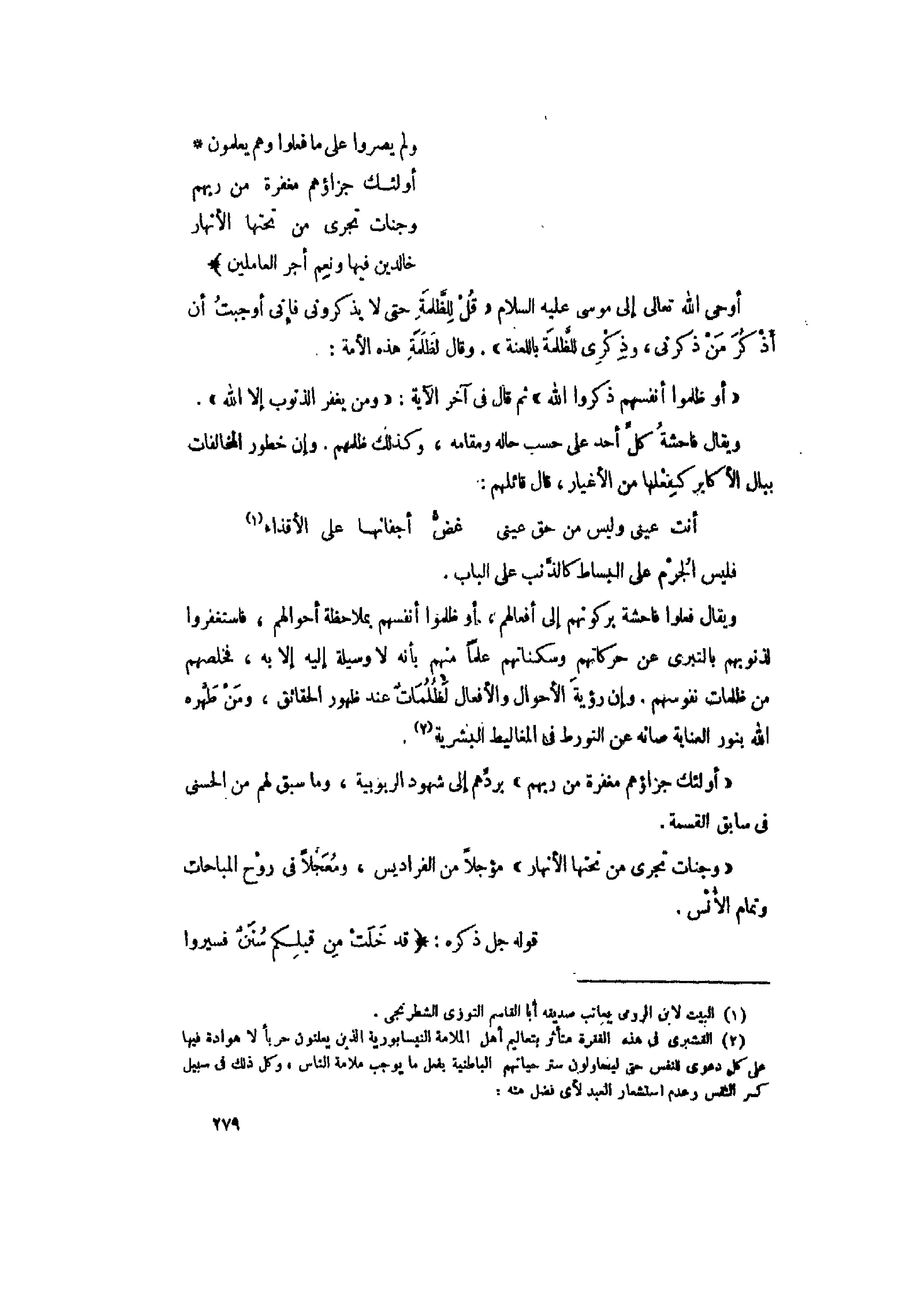 ويقال فعلوا فاحشة بركونهم إلى أفعالهم، أو ظلموا أنفسهم بملاحظة أحوالهم، فاستغفروا لذنوبهم بالتبري عن حركاتهم وسكناتهم علما منهم بأنه لا وسيلة إليه إلا به، فخلصهم من ظلمات نفوسهم. وإن رؤية الأحوال والأفعال لظلمات عند ظهور الحقائق، ومن طهّره الله بنور العناية صانه عن التورط فى المغاليط البشرية «2» .